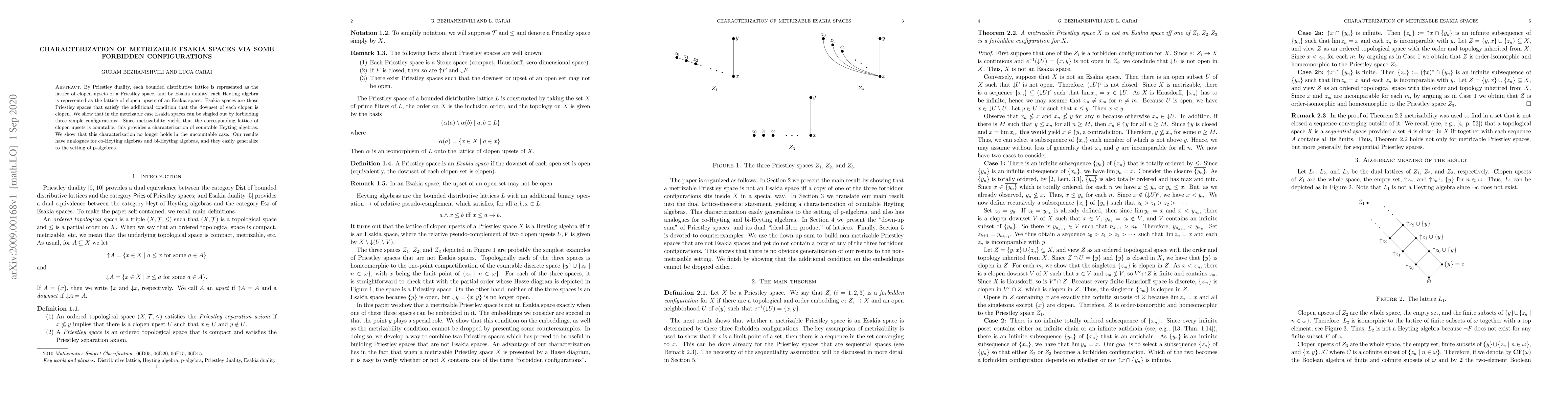 This paper demonstrates that metrizable Esakia spaces, which are Priestley spaces where the downset of each clopen set is also clopen, can be uniquely identified by prohibiting three specific configurations. This characterization extends to countable Heyting algebras, although it fails for uncountable cases. The findings also parallel those for co-Heyting and bi-Heyting algebras, and generalize to p-algebras.