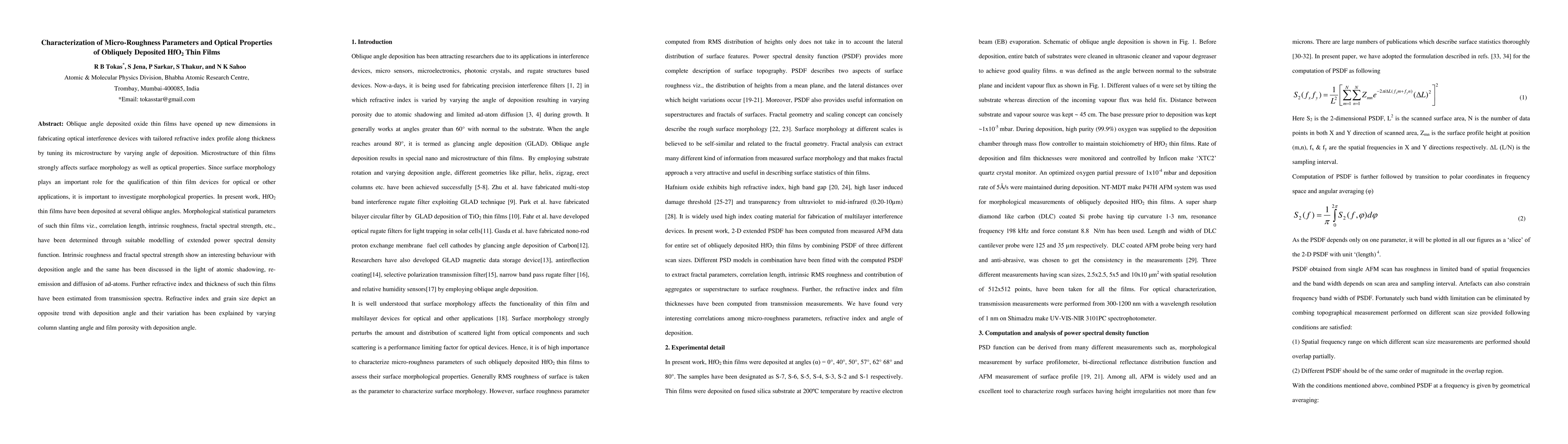 This study investigates the micro-roughness parameters and optical properties of obliquely deposited HfO2 thin films, determining statistical morphology parameters and analyzing their behavior with deposition angle. The findings reveal a relationship between deposition angle, intrinsic roughness, and optical properties, explained through atomic shadowing and film porosity.