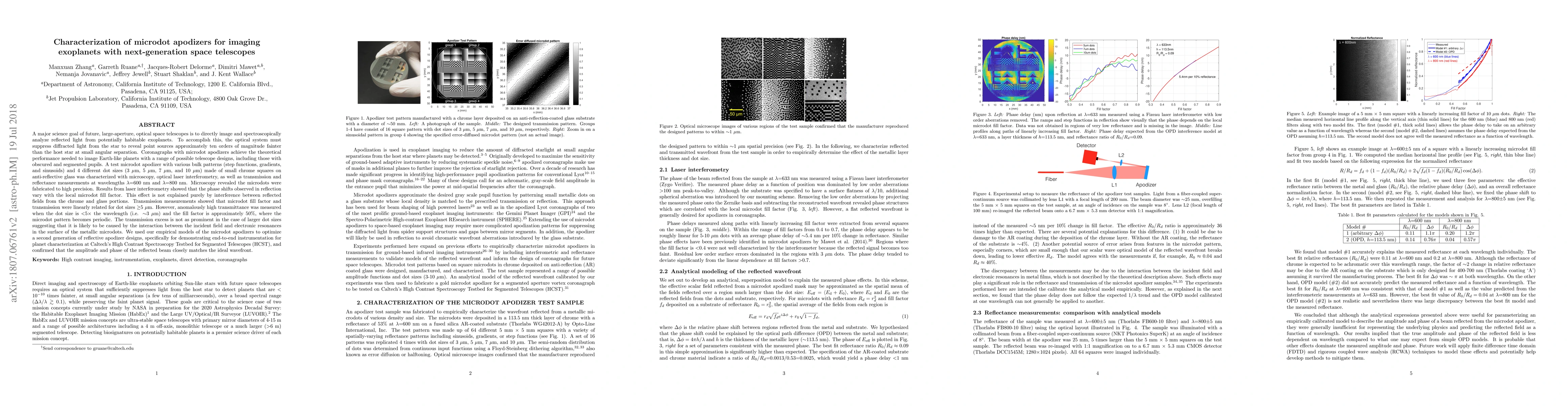 A major science goal of future, large-aperture, optical space telescopes is to directly image and spectroscopically analyze reflected light from potentially habitable exoplanets. To accomplish this, the optical system must suppress diffracted light from the star to reveal point sources approximately ten orders of magnitude fainter than the host star at small angular separation. Coronagraphs with microdot apodizers achieve the theoretical performance needed to image Earth-like planets with a range of possible telescope designs, including those with obscured and segmented pupils. A test microdot apodizer with various bulk patterns (step functions, gradients, and sinusoids) and 4 different dot sizes (3, 5, 7, and 10 $\mu$m) made of small chrome squares on anti-reflective glass was characterized with microscopy, optical laser interferometry, as well as transmission and reflectance measurements at wavelengths of 600 and 800 nm. Microscopy revealed the microdots were fabricated to high precision. Results from laser interferometry showed that the phase shifts observed in reflection vary with the local microdot fill factor. Transmission measurements showed that microdot fill factor and transmission were linearly related for dot sizes >5 $\mu$m. However, anomalously high transmittance was measured when the dot size is <5x the wavelength and the fill factor is approximately 50%, where the microdot pattern becomes periodic. The transmission excess is not as prominent in the case of larger dot sizes suggesting that it is likely to be caused by the interaction between the incident field and electronic resonances in the surface of the metallic microdots. We used our empirical models of the microdot apodizers to optimize a second generation of reflective apodizer designs and confirmed that the amplitude and phase of the reflected beam closely matches the ideal wavefront.