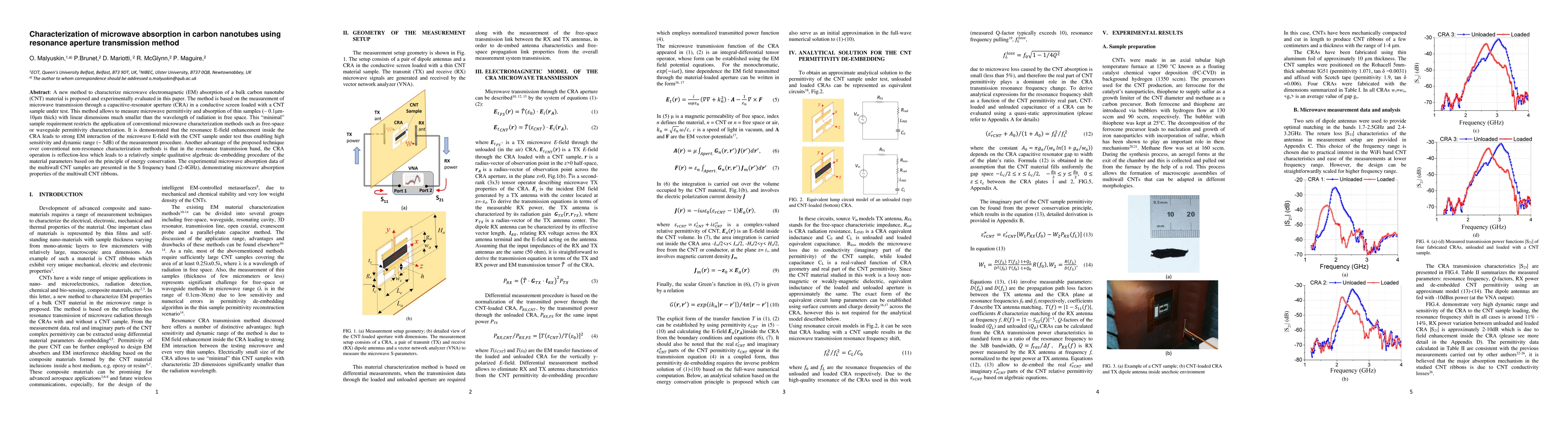 A new method to characterize microwave electromagnetic absorption of a bulk carbon nanotube material is proposed and experimentally evaluated in this paper. The method is based on the measurement of microwave transmission through a capacitive-resonator aperture in a conductive screen loaded with a CNT sample under test. This method allows to measure microwave permittivity and absorption of thin samples, several atomic layers to few micrometers thick, with linear dimensions much smaller than the wavelength of radiation in free space. This minimal sample requirement restricts the application of conventional microwave characterization methods such as free-space or waveguide permittivity characterization. It is demonstrated that the resonance E-field enhancement inside the CRA leads to strong EM interaction of the microwave E-field with the CNT sample under test thus enabling high sensitivity and dynamic range of the measurement procedure. Another advantage of the proposed technique over conventional non-resonance characterization methods is that in the resonance transmission band, the CRA operation is reflection-less which leads to a relatively simple qualitative algebraic de-embedding procedure of the material parameters based on the principle of energy conservation. The experimental microwave absorption data of the multiwall CNT samples are presented in the S frequency band (2-4GHz), demonstrating microwave absorption properties of the multiwall CNT ribbons.