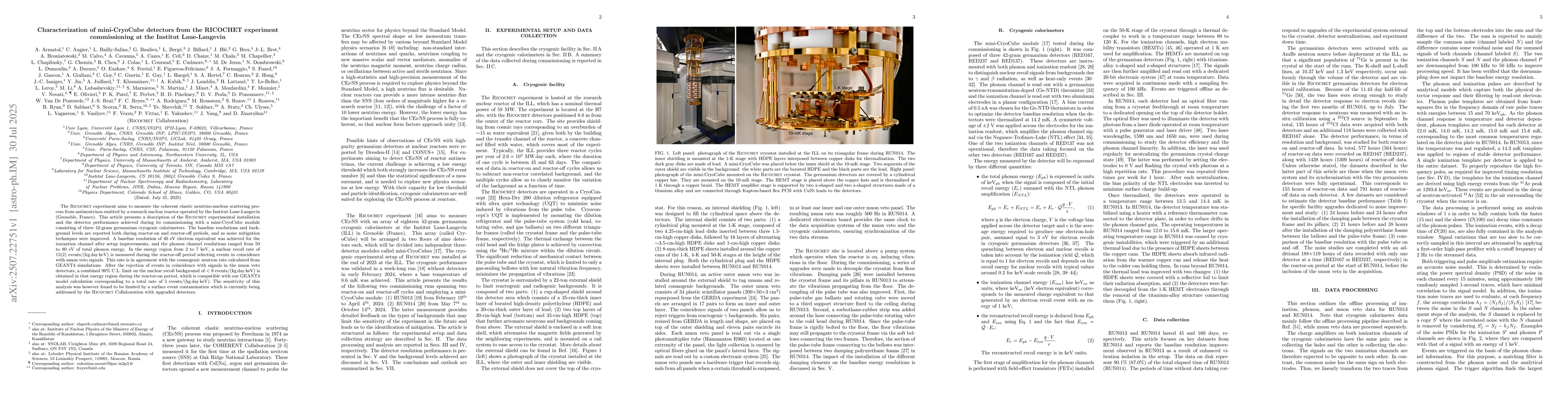 The Ricochet experiment characterized mini-CryoCube detectors using a germanium cryogenic calorimeter with heat and ionization readout, installed at the Institut Laue-Langevin. The setup underwent commissioning in 2024, with performance improvements through vibration mitigation measures.