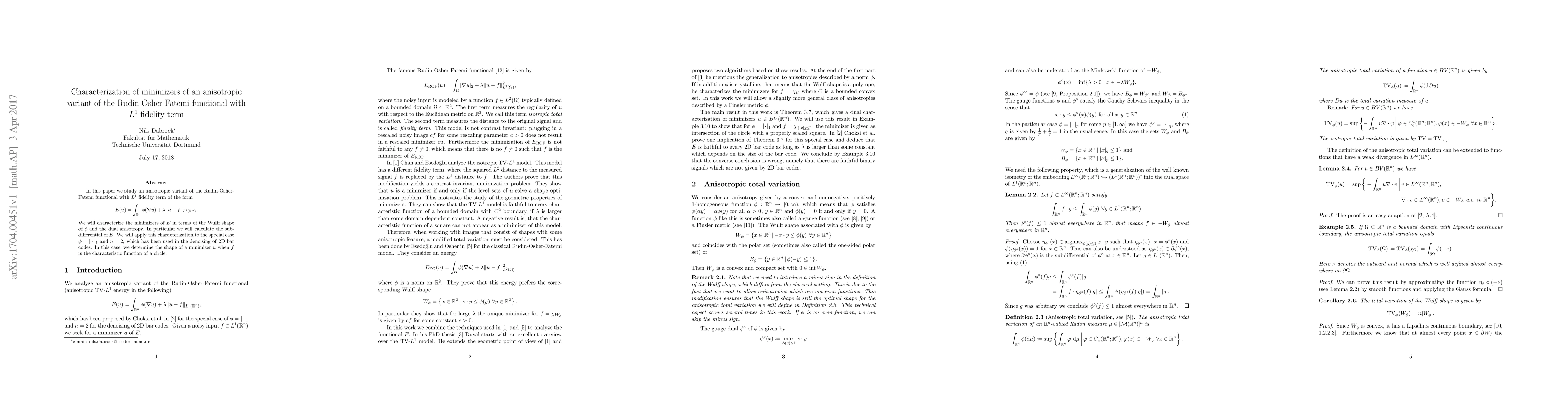 This paper characterizes minimizers of an anisotropic variant of the Rudin-Osher-Fatemi functional with an $L^1$ fidelity term, focusing on the relationship between the Wulff shape and dual anisotropy. It applies the findings to a special case involving 2D bar code denoising, determining the shape of minimizers for a circular characteristic function.