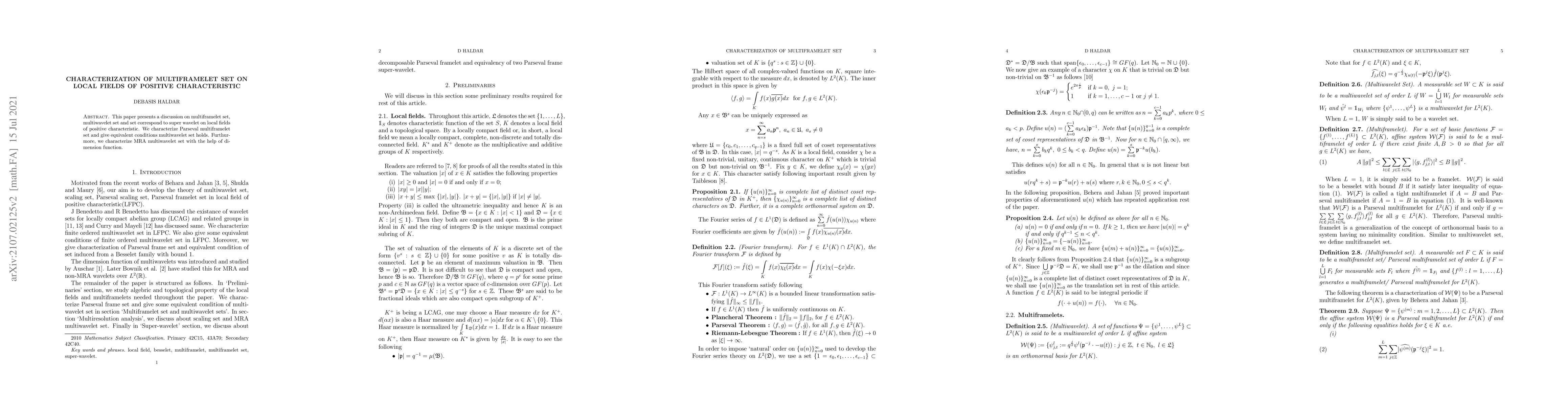 This paper presents a discussion on multiframelet set, multiwavelet set and set correspond to super wavelet on local fields of positive characteristic. We characterize Parseval multiframelet set and give equivalent conditions multiwavelet set holds. Furthurmore, we characterize MRA multiwavelet set with the help of dimension function.