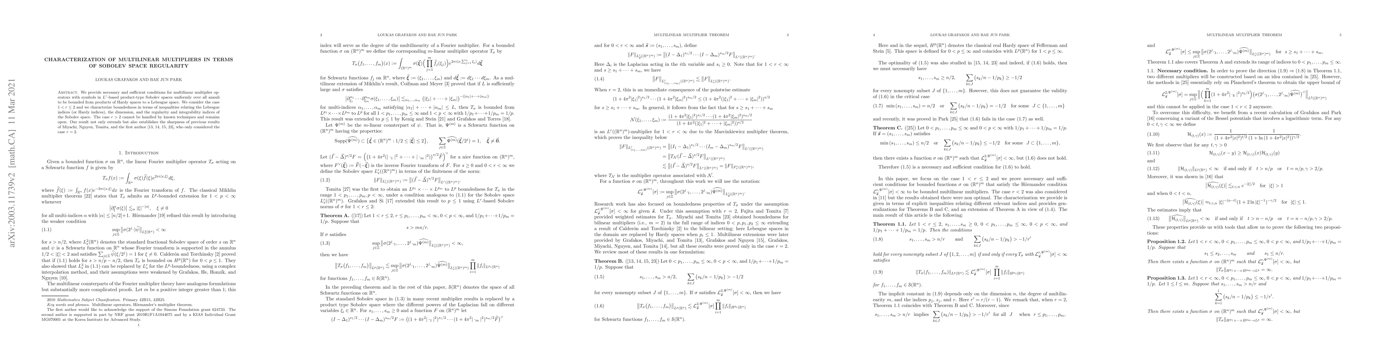 This research paper presents necessary and sufficient conditions for multilinear multiplier operators, characterizing their boundedness from products of Hardy spaces to a Lebesgue space using Sobolev space regularity. The study focuses on the case where 1<r≤2, extending previous results by Miyachi, Nguyen, Tomita, and the authors, which only considered r=2. The paper also highlights that the case r>2 remains unsolved with current techniques.