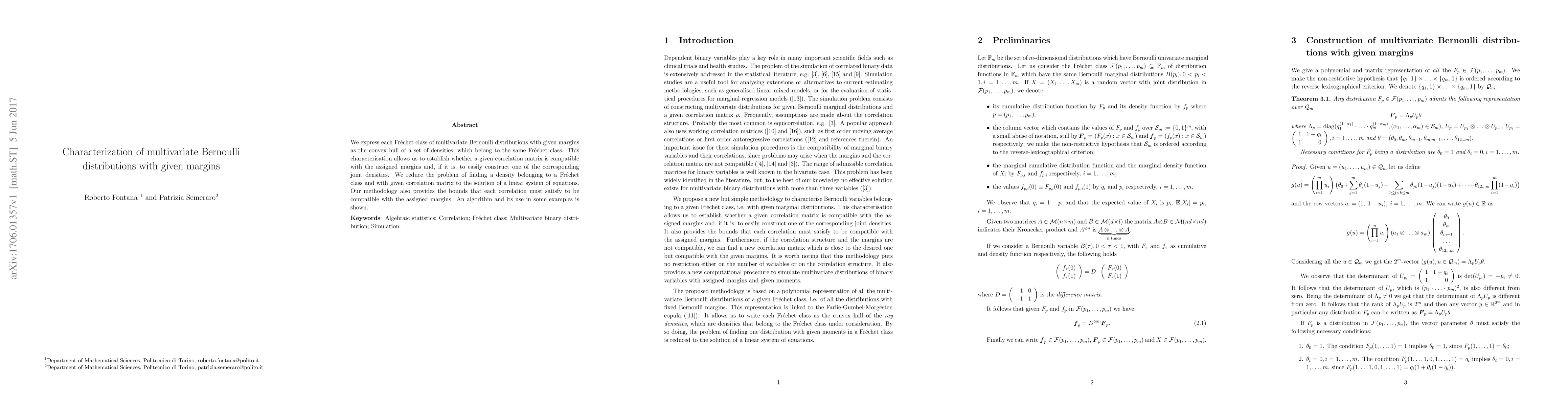 Researchers found a way to represent multivariate Bernoulli distributions with given margins as the convex hull of a set of densities, allowing them to easily construct joint densities from correlation matrices.