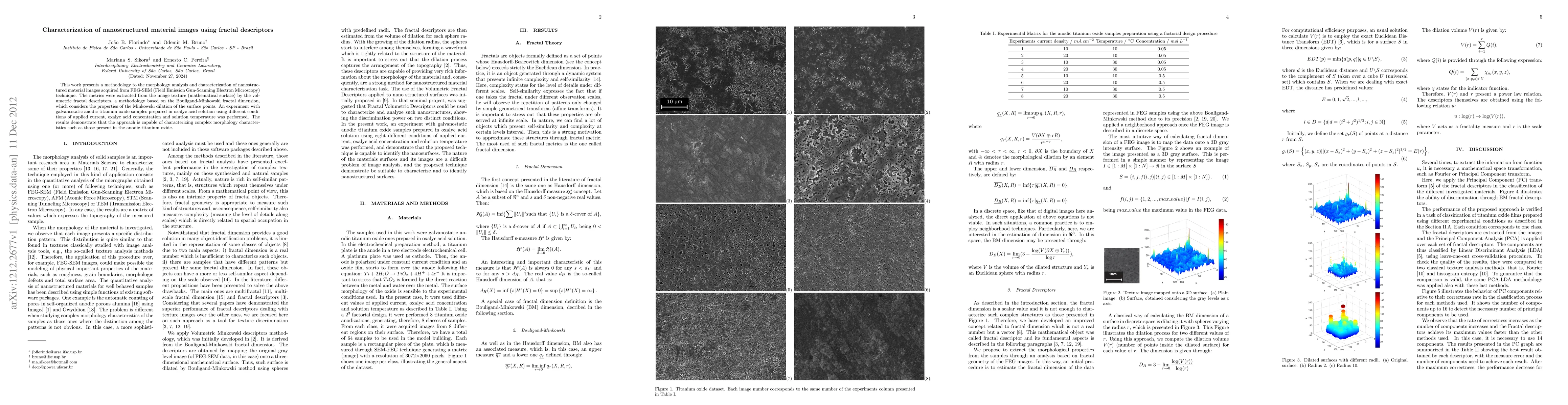 This paper proposes a methodology for analyzing and characterizing nanostructured material images via fractal descriptors derived from volumetric fractal dimensions, specifically using the Bouligand-Minkowski fractal dimension. The method was tested on anodic titanium oxide samples, demonstrating its effectiveness in capturing complex morphological features.