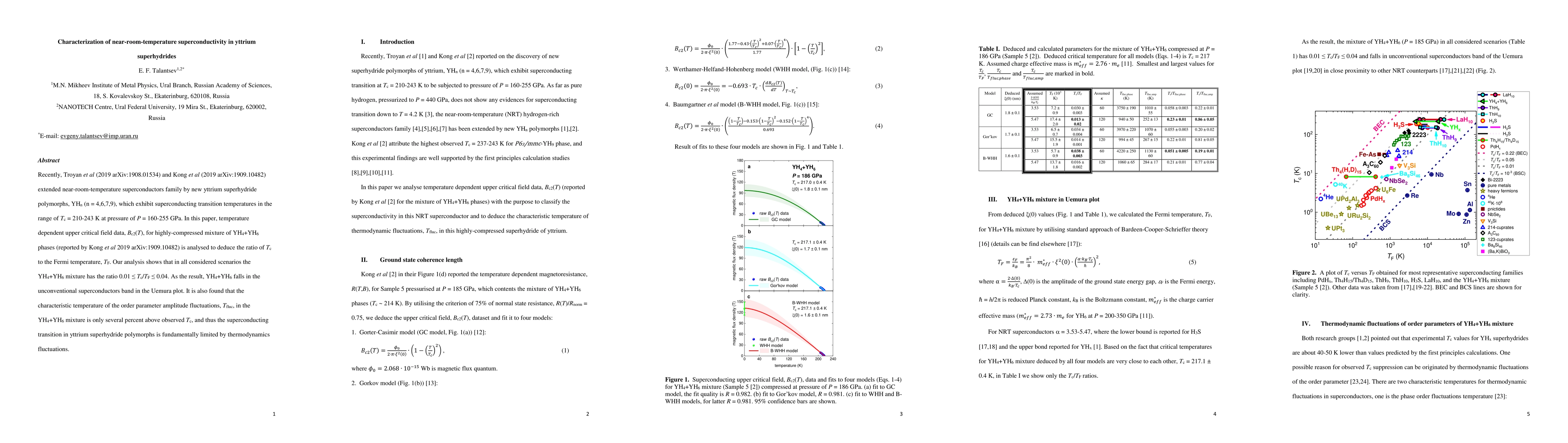 Recently, Troyan et al (2019 arXiv:1908.01534) and Kong et al (2019 arXiv:1909.10482) extended near-room-temperature superconductors family by new yttrium superhydride polymorphs, YHn (n = 4,6,7,9), which exhibit superconducting transition temperatures in the range of Tc = 210-243 K at pressure of P = 160-255 GPa. In this paper, temperature dependent upper critical field data, Bc2(T), for highly-compressed mixture of YH4+YH6 phases (reported by Kong et al 2019 arXiv:1909.10482) is analysed to deduce the ratio of Tc to the Fermi temperature, Tf. Our analysis shows that in all considered scenarios the YH4+YH6 mixture has the ratio 0.01 < Tc/Tf < 0.04. As the result, YH4+YH6 falls in the unconventional superconductors band in the Uemura plot. It is also found that the characteristic temperature of the order parameter amplitude fluctuations, Tfluc, in the YH4+YH6 mixture is only several percent above observed Tc, and thus the superconducting transition in yttrium superhydride polymorphs is fundamentally limited by thermodynamics fluctuations.