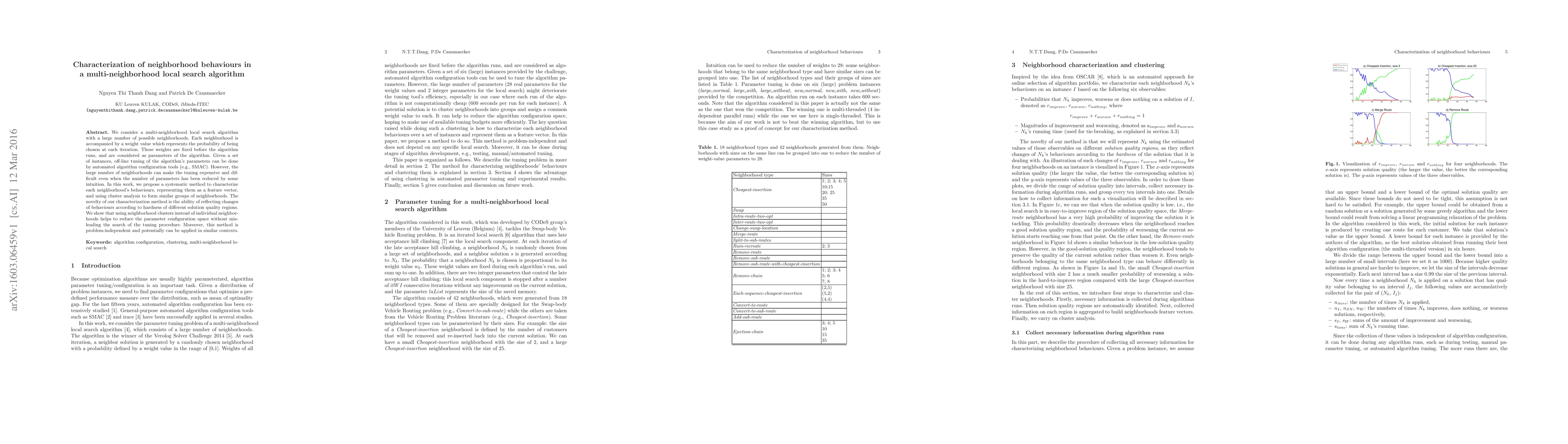 We consider a multi-neighborhood local search algorithm with a large number of possible neighborhoods. Each neighborhood is accompanied by a weight value which represents the probability of being chosen at each iteration. These weights are fixed before the algorithm runs, and are considered as parameters of the algorithm. Given a set of instances, off-line tuning of the algorithm's parameters can be done by automated algorithm configuration tools (e.g., SMAC). However, the large number of neighborhoods can make the tuning expensive and difficult even when the number of parameters has been reduced by some intuition. In this work, we propose a systematic method to characterize each neighborhood's behaviours, representing them as a feature vector, and using cluster analysis to form similar groups of neighborhoods. The novelty of our characterization method is the ability of reflecting changes of behaviours according to hardness of different solution quality regions. We show that using neighborhood clusters instead of individual neighborhoods helps to reduce the parameter configuration space without misleading the search of the tuning procedure. Moreover, this method is problem-independent and potentially can be applied in similar contexts.