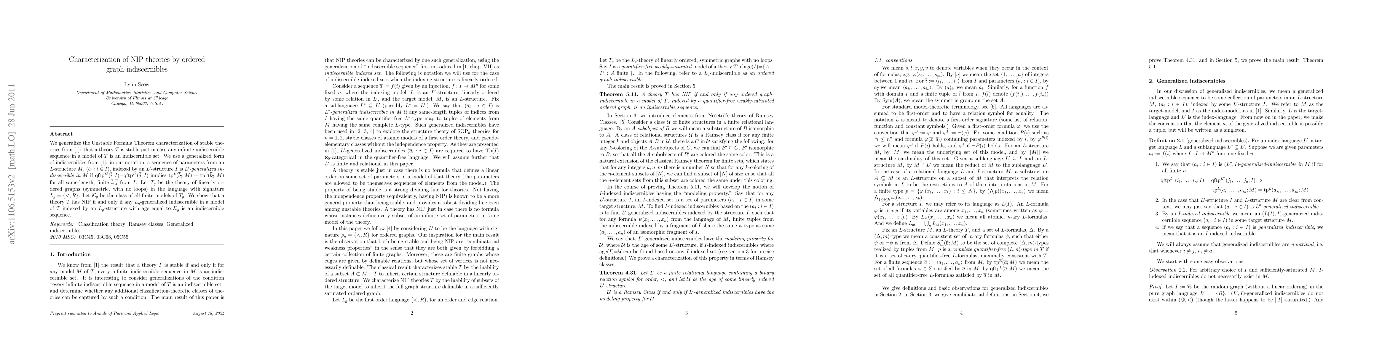 The paper generalizes the Unstable Formula Theorem to NIP (Not Impossible) theories by characterizing them through ordered graph-indiscernibles. It shows that a theory has NIP if and only if any $L_g$-generalized indiscernible sequence in a model of $T$, indexed by an $L_g$-structure with age equal to $\K_g$, is an indiscernible sequence.