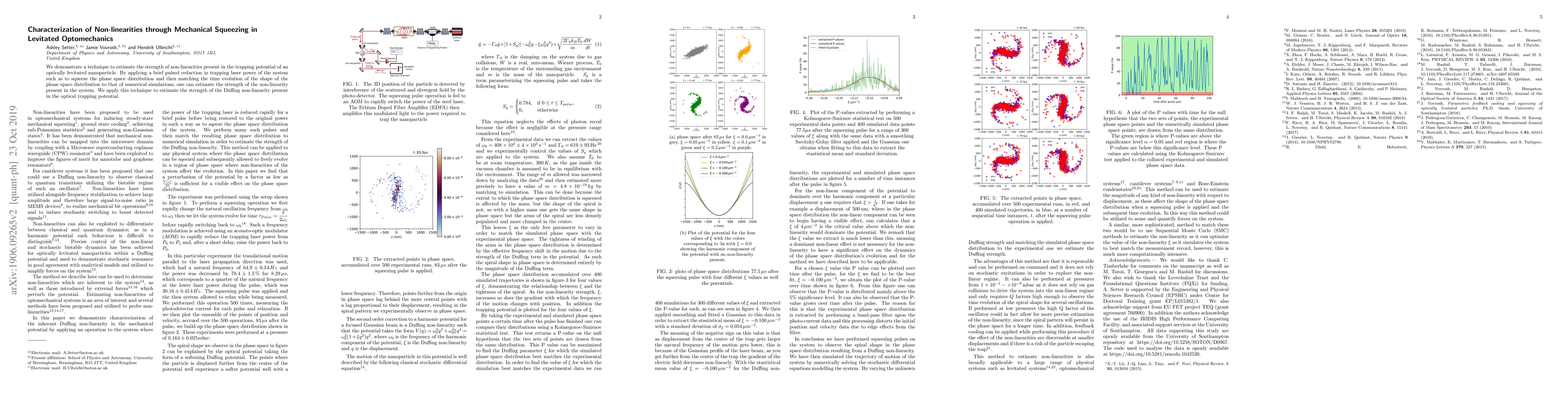 The paper presents a method to measure non-linearities in optically levitated nanoparticle systems using mechanical squeezing. By temporarily reducing laser power and comparing phase space distribution changes to simulations, researchers estimated Duffing non-linearity strength in the trapping potential.