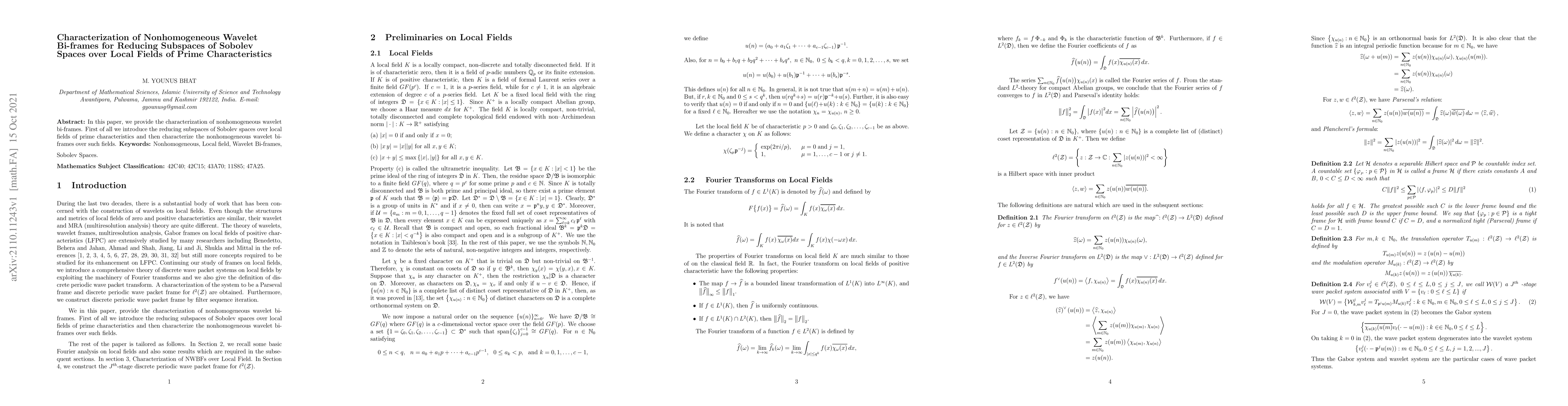 This paper characterizes nonhomogeneous wavelet bi-frames that reduce subspaces of Sobolev spaces over local fields with prime characteristics. It provides a framework for understanding how these frames can be used to simplify complex mathematical expressions.