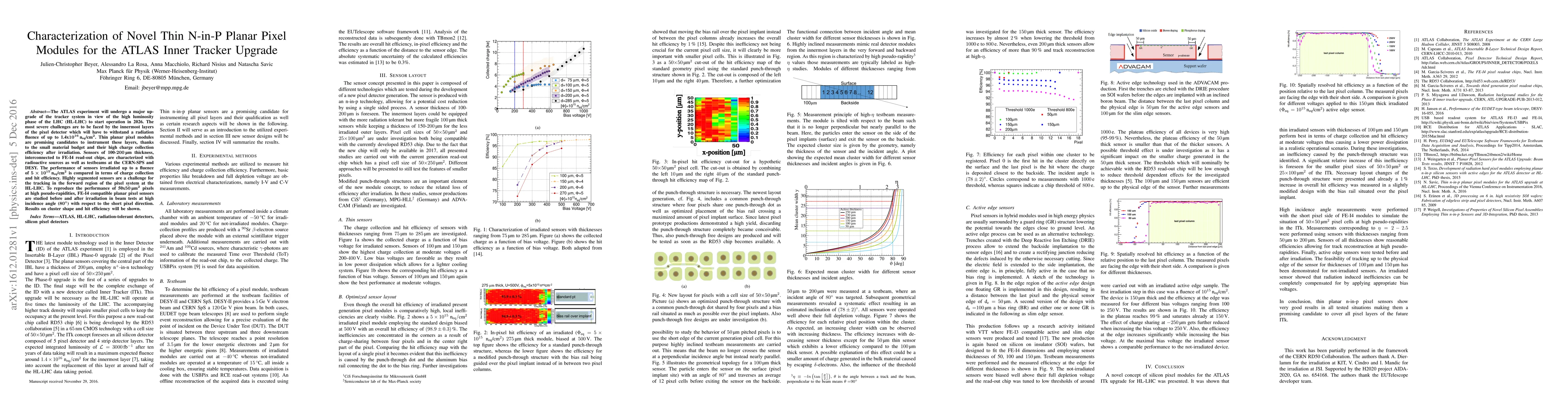 This paper characterizes novel thin N-in-P planar pixel modules for the ATLAS Inner Tracker Upgrade, focusing on their performance under high radiation conditions. The modules, with sensors of 100-200 µm thickness, are tested for charge collection and hit efficiency after irradiation up to $5\times10^{15}\,$n$_\text{eq}$/cm$^{2}$, showing promising results for the high luminosity phase of the LHC.