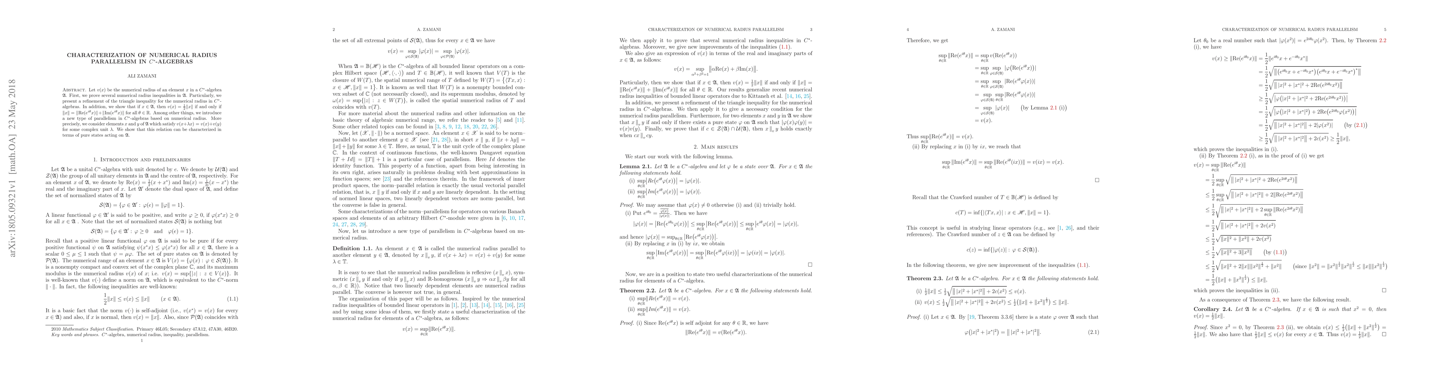 Let $v(x)$ be the numerical radius of an element $x$ in a $C^*$-algebra $\mathfrak{A}$. First, we prove several numerical radius inequalities in $\mathfrak{A}$. Particularly, we present a refinement of the triangle inequality for the numerical radius in $C^*$-algebras. In addition, we show that if $x\in\mathfrak{A}$, then $v(x) = \frac{1}{2}\|x\|$ if and only if $\|x\| = \|\mbox{Re}(e^{i\theta}x)\| + \|\mbox{Im}(e^{i\theta}x)\|$ for all $\theta \in \mathbb{R}$. Among other things, we introduce a new type of parallelism in $C^*$-algebras based on numerical radius. More precisely, we consider elements $x$ and $y$ of $\mathfrak{A}$ which satisfy $v(x + \lambda x) = v(x) + v(y)$ for some complex unit $\lambda$. We show that this relation can be characterized in terms of pure states acting on $\mathfrak{A}$.