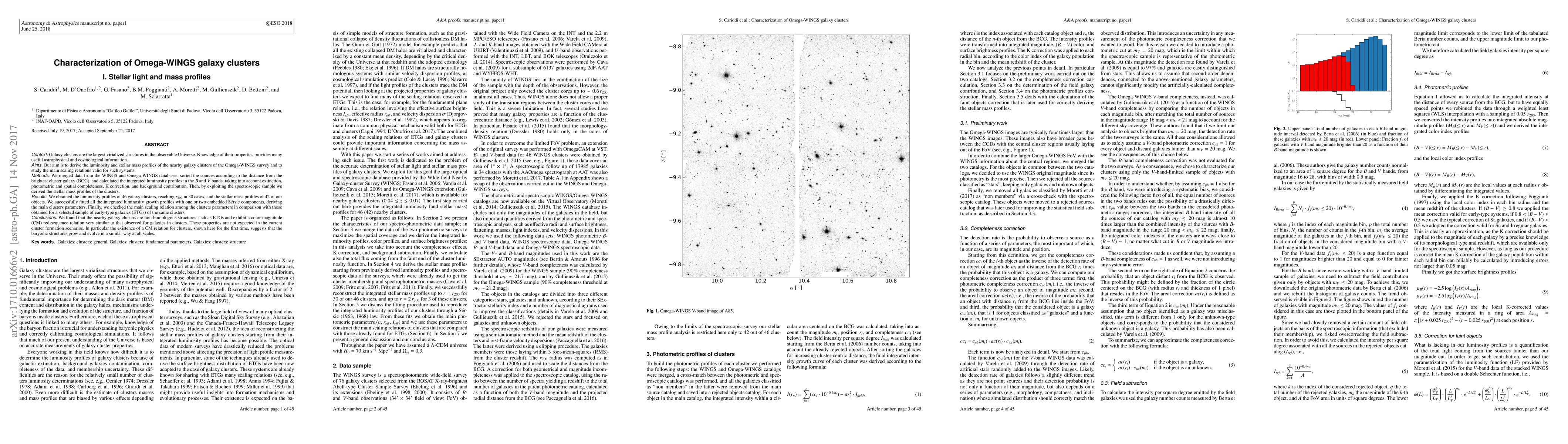 This paper characterizes the luminosity and stellar mass profiles of nearby galaxy clusters from the Omega-WINGS survey, finding that these clusters exhibit non-homologous structures and a color-magnitude red-sequence relation similar to early-type galaxies, challenging current cluster formation models.