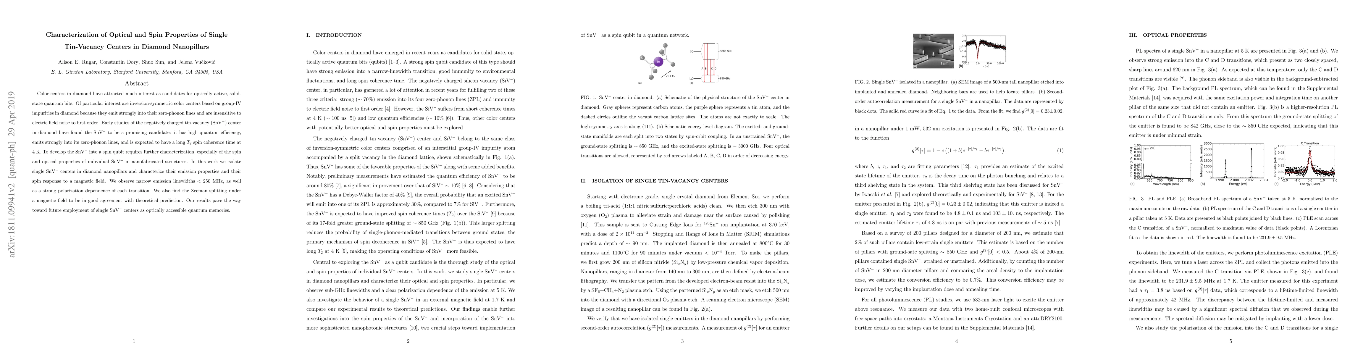 Color centers in diamond have attracted much interest as candidates for optically active, solid-state quantum bits. Of particular interest are inversion-symmetric color centers based on group-IV impurities in diamond because they emit strongly into their zero-phonon lines and are insensitive to electric field noise to first order. Early studies of the negatively-charged tin-vacancy (SnV$^{-}$) center in diamond have found the SnV$^{-}$ to be a promising candidate: it has high quantum efficiency, emits strongly into its zero-phonon lines, and is expected to have a long $T_2$ spin coherence time at 4~K. To develop the SnV$^{-}$ into a spin qubit requires further characterization, especially of the spin and optical properties of individual SnV$^{-}$ in nanofabricated structures. In this work we isolate single SnV$^{-}$ centers in diamond nanopillars and characterize their emission properties and their spin response to a magnetic field. We observe narrow emission linewidths that are spectrometer-limited, as well as a strong polarization dependence of each transition. We also find the Zeeman splitting under a magnetic field to be in good agreement with theoretical prediction. Our results pave the way toward future employment of single SnV$^{-}$s for optically accessible quantum memories.