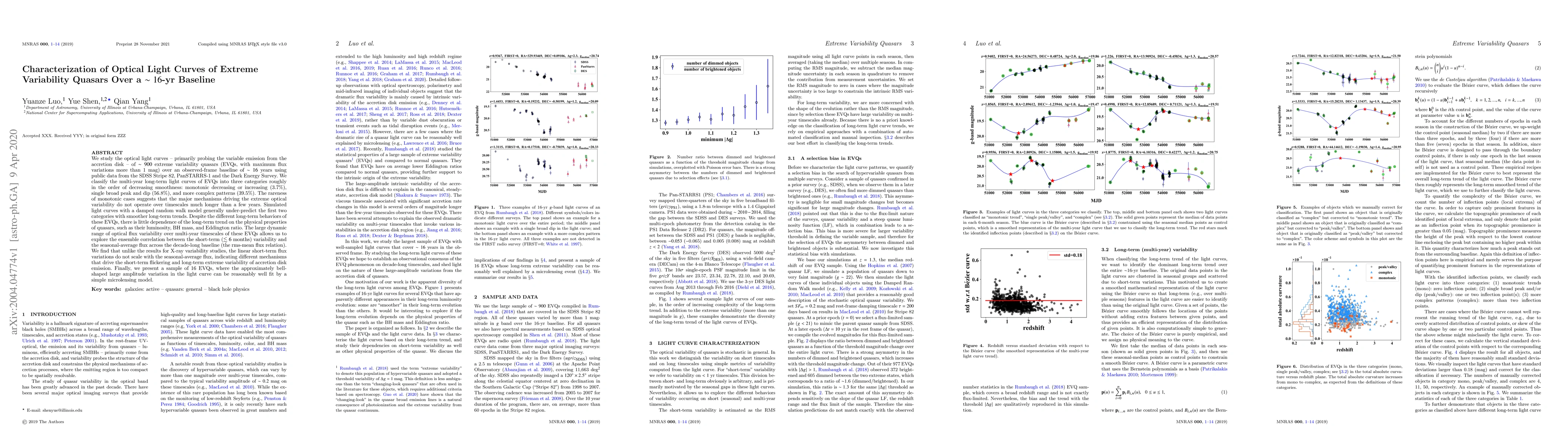 Researchers analyzed 900 extreme variability quasars over 16 years, finding that most light curves follow smooth long-term trends or single broad peaks, with less complex patterns; they also discovered a link between short-term flux variations and seasonal-average flux.