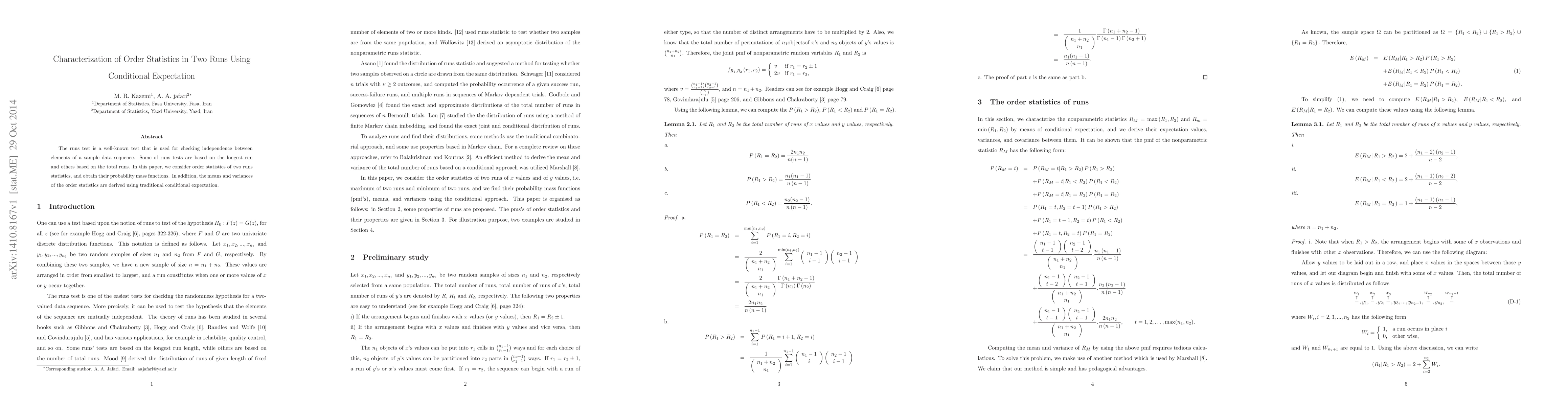 This paper investigates the order statistics of two runs in a sample data sequence, deriving their probability mass functions and calculating the means and variances using conditional expectation methods. The study enhances the understanding of runs tests used for assessing independence within data sequences.