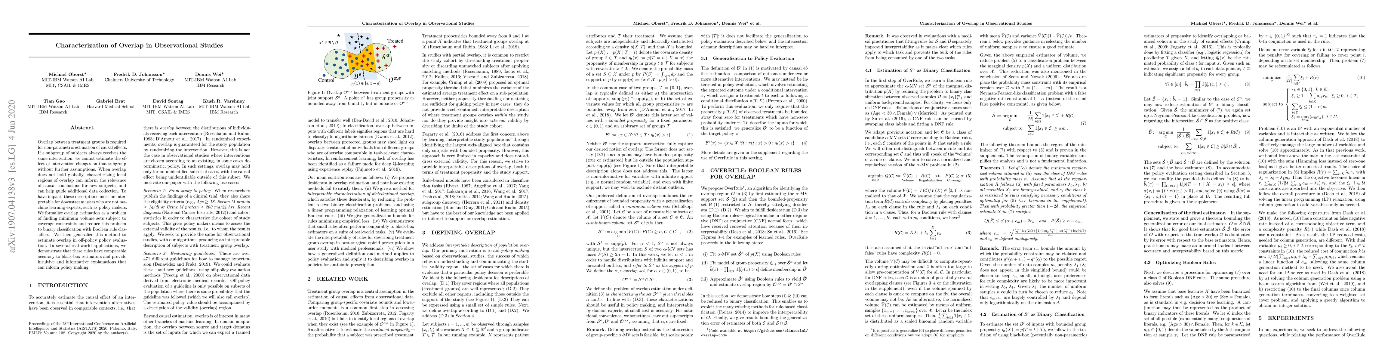Overlap between treatment groups is required for non-parametric estimation of causal effects. If a subgroup of subjects always receives the same intervention, we cannot estimate the effect of intervention changes on that subgroup without further assumptions. When overlap does not hold globally, characterizing local regions of overlap can inform the relevance of causal conclusions for new subjects, and can help guide additional data collection. To have impact, these descriptions must be interpretable for downstream users who are not machine learning experts, such as policy makers. We formalize overlap estimation as a problem of finding minimum volume sets subject to coverage constraints and reduce this problem to binary classification with Boolean rule classifiers. We then generalize this method to estimate overlap in off-policy policy evaluation. In several real-world applications, we demonstrate that these rules have comparable accuracy to black-box estimators and provide intuitive and informative explanations that can inform policy making.