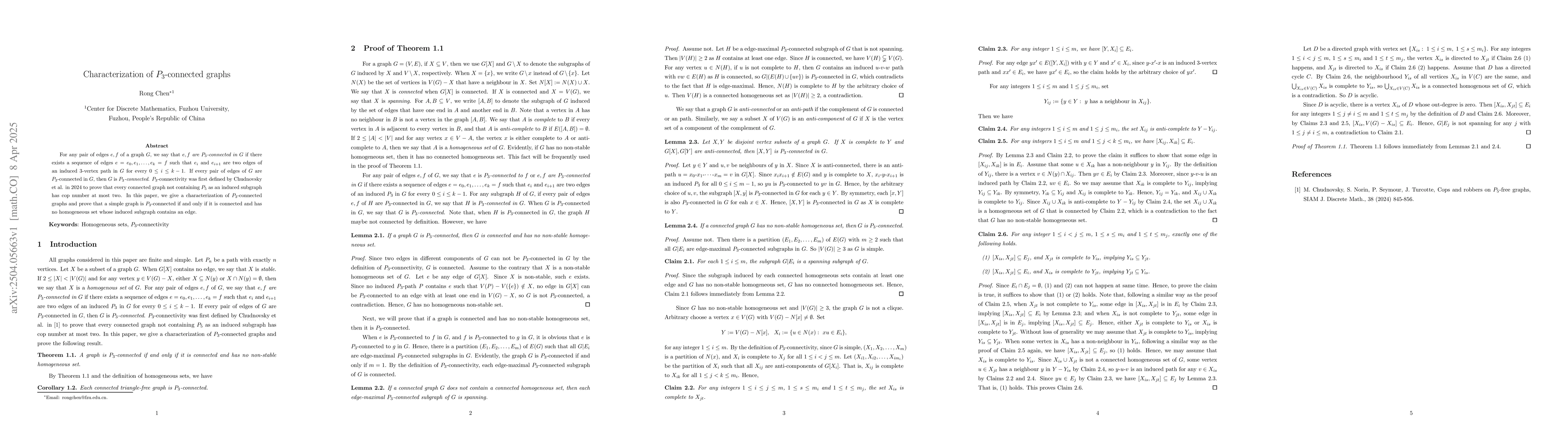 The main technical contribution is the characterization theorem for $P_3$-connected graphs, linking connectivity properties to the absence of specific homogeneous sets.