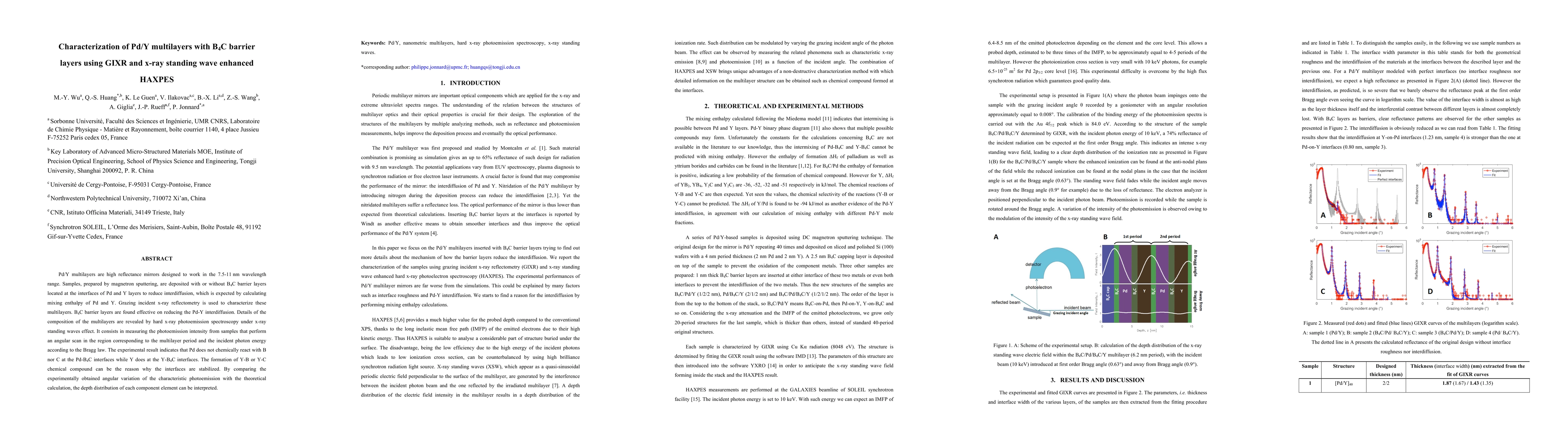 This study characterizes Pd/Y multilayers with B4C barrier layers using grazing incident x-ray reflectometry (GIXR) and x-ray standing wave enhanced hard x-ray photoemission spectroscopy (HAXPES). B4C barriers effectively reduce Pd-Y interdiffusion, and HAXPES reveals that Pd does not chemically react with B or C, while Y does at the Y-B4C interfaces, potentially forming Y-B or Y-C compounds that stabilize the interfaces.
