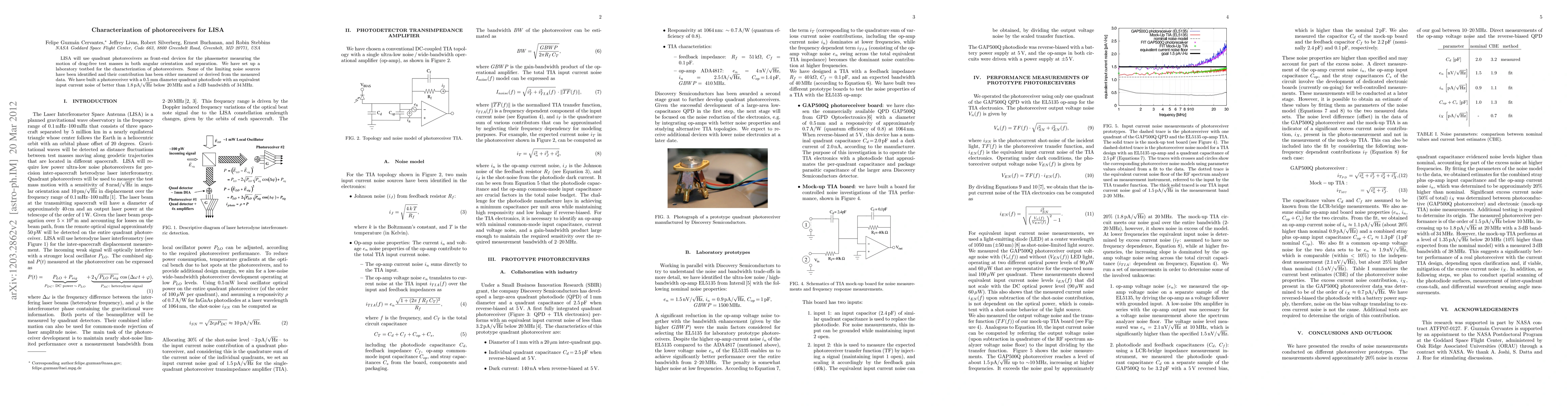 LISA will use quadrant photoreceivers as front-end devices for the phasemeter measuring the motion of drag-free test masses in both angular orientation and separation. We have set up a laboratory testbed for the characterization of photoreceivers. Some of the limiting noise sources have been identified and their contribution has been either measured or derived from the measured data. We have built a photoreceiver with a 0.5 mm diameter quadrant photodiode with an equivalent input current noise of better than 1.8 pA/sqrt[Hz] below 20 MHz and a 3dB bandwidth of 34 MHz.
