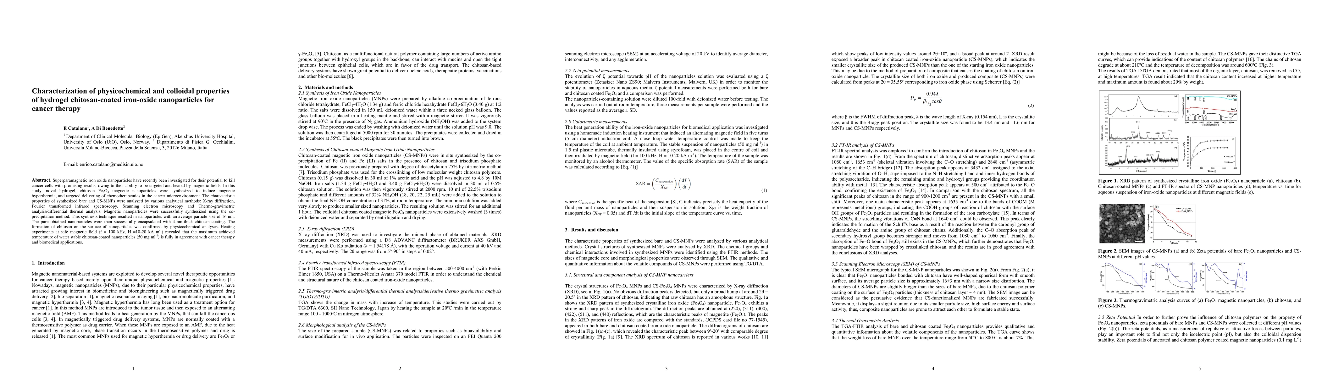 This study synthesizes chitosan-coated iron oxide nanoparticles for cancer therapy through magnetic hyperthermia and targeted drug delivery. The physicochemical properties of the nanoparticles, coated with a 4-nm thick chitosan layer, were analyzed using X-ray diffraction, FTIR, SEM, and TGA/DTA, confirming successful synthesis and coating. Heating experiments showed safe temperature rise suitable for cancer treatment.