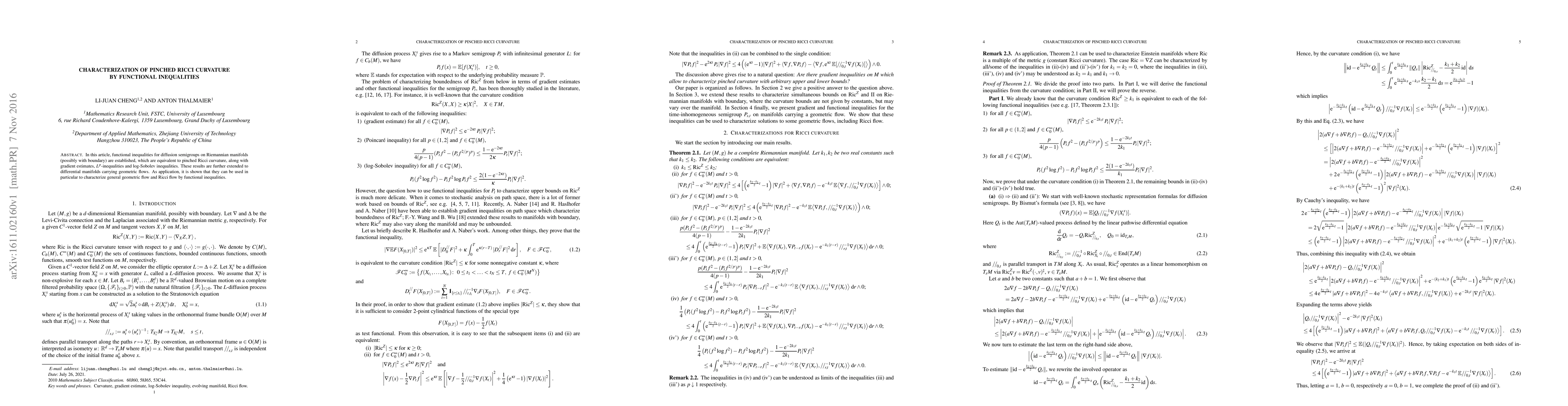 In this article, functional inequalities for diffusion semigroups on Riemannian manifolds (possibly with boundary) are established, which are equivalent to pinched Ricci curvature, along with gradient estimates, $L^p$-inequalities and log-Sobolev inequalities. These results are further extended to differential manifolds carrying geometric flows. As application, it is shown that they can be used in particular to characterize general geometric flow and Ricci flow by functional inequalities.