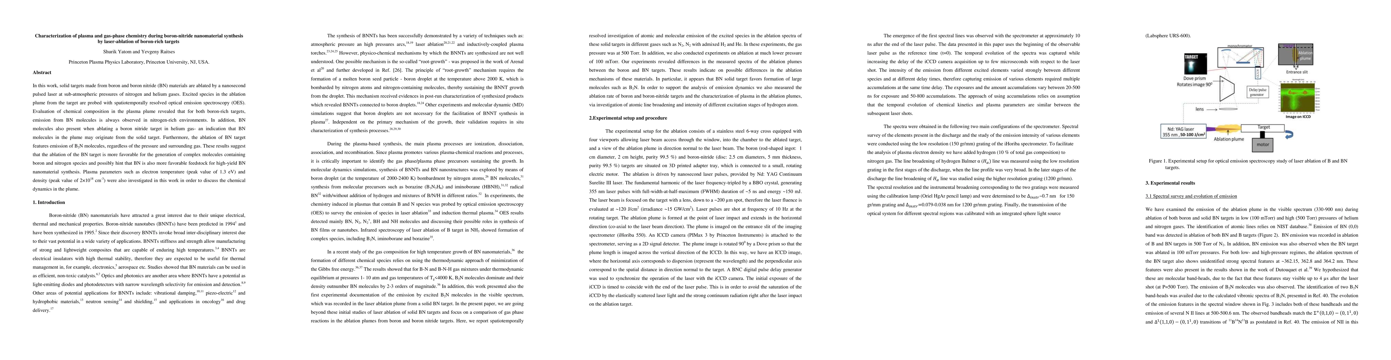 This study investigates the plasma and gas-phase chemistry during the laser-ablation synthesis of boron-nitride nanomaterials, revealing that BN molecules are consistently formed in nitrogen-rich environments and also detected in helium gas, indicating their origin from the solid target. Additionally, B2N molecules are emitted regardless of the gas pressure, suggesting favorable conditions for generating complex boron-nitrogen molecules and potentially high-yield BN nanomaterial synthesis.