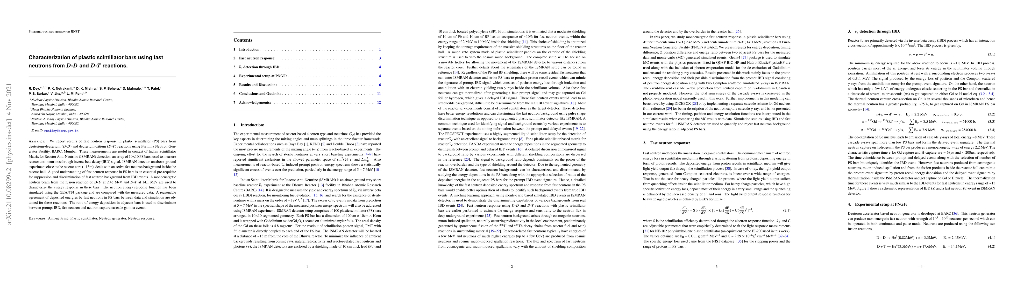 This paper characterizes the fast neutron response in plastic scintillator bars from D-D and D-T reactions, using the Purnima Neutron Generator Facility. The results are crucial for the ISMRAN detector, which aims to measure reactor anti-neutrinos, and involve simulating neutron energy responses using GEANT4 to compare with experimental data.