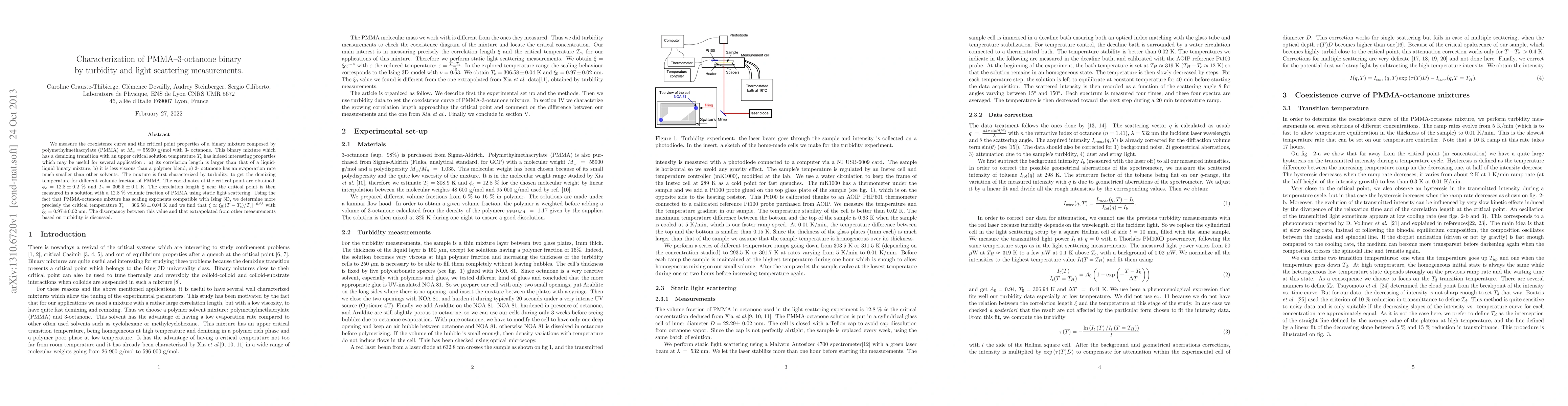 We measure the coexistence curve and the critical point properties of a binary mixture composed by polymethylmethacrylate (PMMA) at $M_w = 55900$ g/mol with 3- octanone. This binary mixture which has a demixing transition with an upper critical solution temperature $T_c$ has indeed interesting properties which may be useful for several application : a) its correlation length is larger than that of a liquid-liquid binary mixture, b) it is less viscous than a polymer blend; c) 3- octanone has an evaporation rate much smaller than other solvents. The mixture is first characterized by turbidity, to get the demixing temperature for different volumic fraction of PMMA. The coordinates of the critical point are obtained: $\phi_c = 12.8\pm0.2$ % and $T_c = 306.5\pm0.1$ K. The correlation length $\xi$ near the critical point is then measured in a solution with a 12.8% volumic fraction of PMMA using static light scattering. Using the fact that PMMA-octanone mixture has scaling exponents compatible with Ising 3D, we determine more precisely the critical temperature $T_c = 306.58\pm0.04$ K and we find that $\xi \simeq \xi_0 [(T-T_c)/{T_c}]^{-0.63}$ with $\xi_0 = 0.97\pm 0.02$ nm. The discrepancy between this value and that extrapolated from other measurements based on turbidity is discussed.