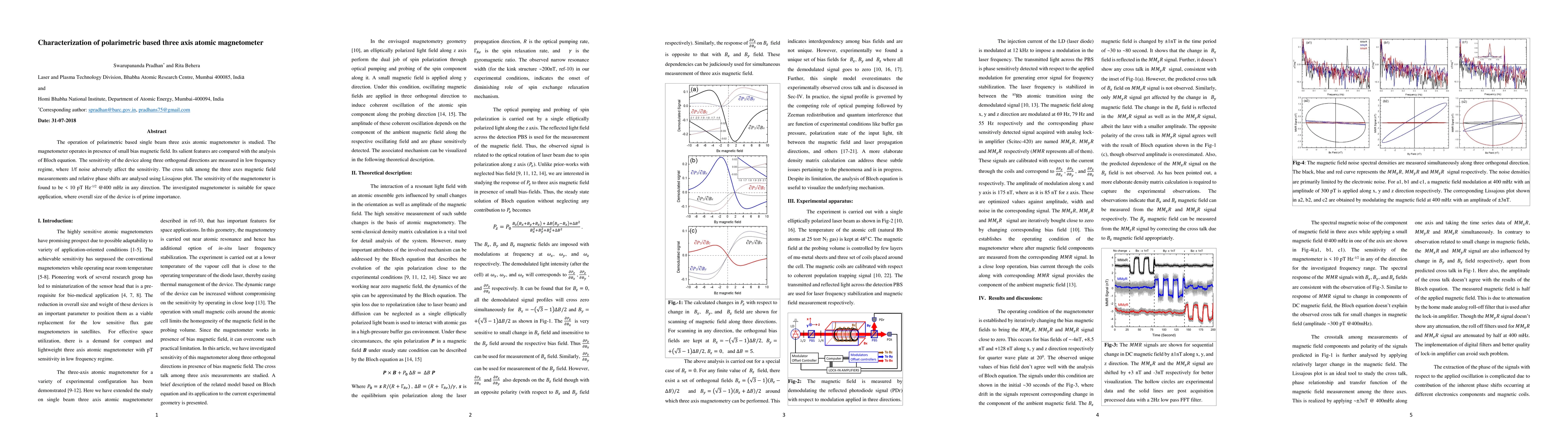 The operation of polarimetric based single beam three axis atomic magnetometer is studied. The magnetometer operates in presence of small bias magnetic field. Its salient features are compared with the analysis of Bloch equation. The sensitivity of the device along three orthogonal directions are measured in low frequency regime, where 1/f noise adversely affect the sensitivity. The cross talk among the three axes magnetic field measurements and relative phase shifts are analysed using Lissajous plot. The sensitivity of the magnetometer is found to be < 10 pT/sqrt(Hz) @400 mHz in any direction. The investigated magnetometer is suitable for space application, where overall size of the device is of prime importance.