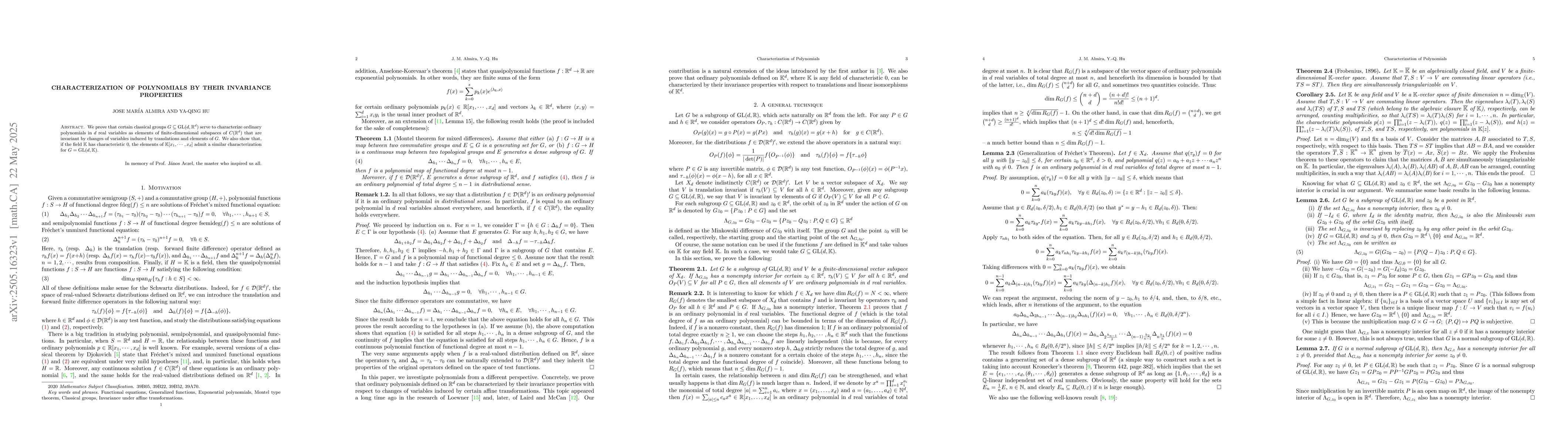 We prove that certain classical groups $G\subseteq {\rm GL}(d,\mathbb{R}^d)$ serve to characterize ordinary polynomials in $d$ real variables as elements of finite-dimensional subspaces of $C(\mathbb{R}^d)$ that are invariant by changes of variables induced by translations and elements of $G$. We also show that, if the field $\mathbb{K}$ has characteristic $0$, the elements of $\mathbb{K}[x_1,\cdots,x_d]$ admit a similar characterization for $G= {\rm GL}(d,\mathbb{K})$.