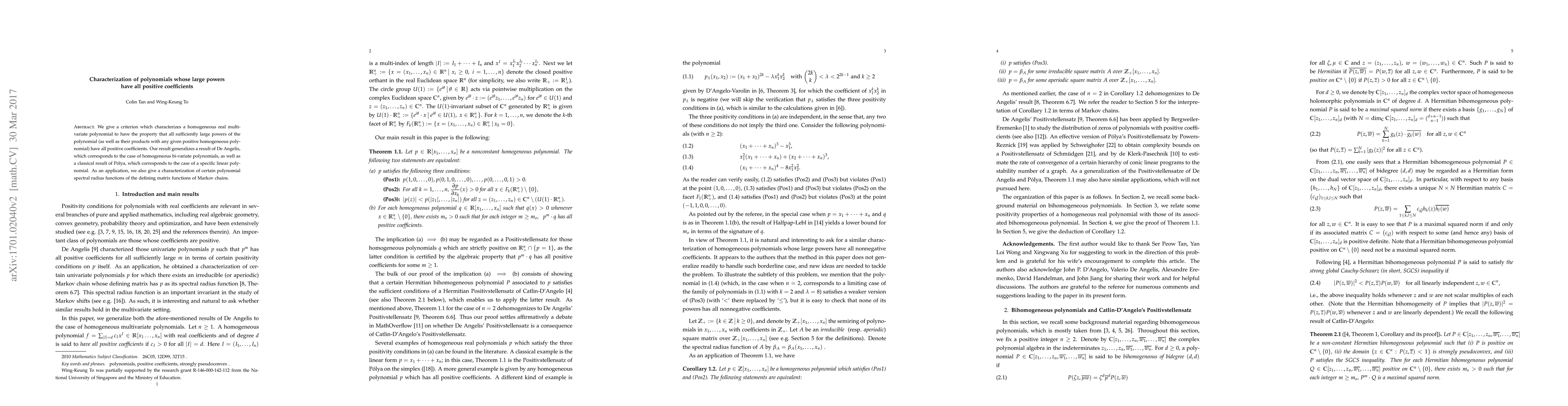 This paper provides a criterion for homogeneous real multi-variate polynomials whose large powers have all positive coefficients, generalizing prior results for bi-variate and specific linear polynomials. An application characterizes polynomial beta functions, which are the spectral radius functions of Markov chains.