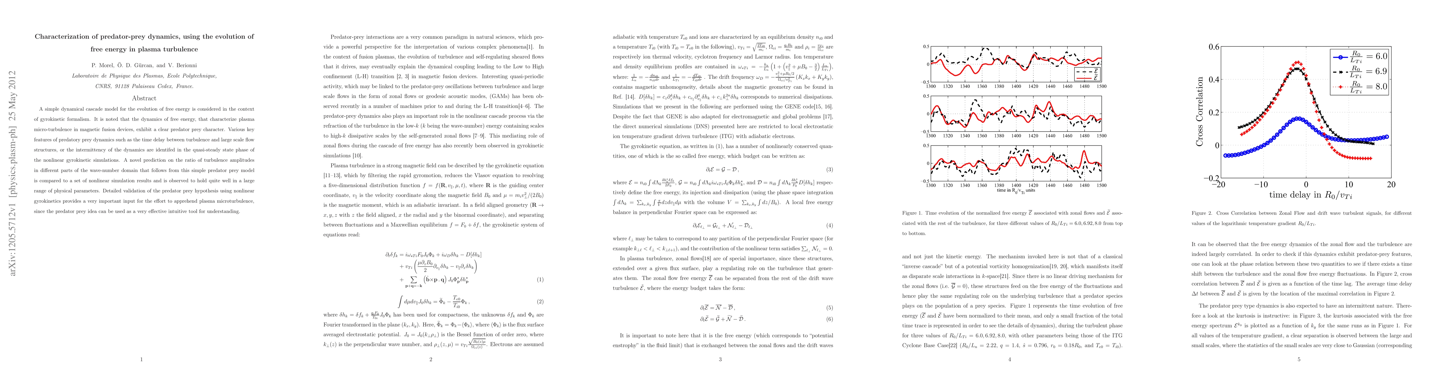 This paper characterizes plasma micro-turbulence in magnetic fusion devices using a dynamical cascade model, revealing predator-prey dynamics in the evolution of free energy. The model predicts a consistent ratio of turbulence amplitudes across different wave-number domains, validated by nonlinear gyrokinetic simulations.