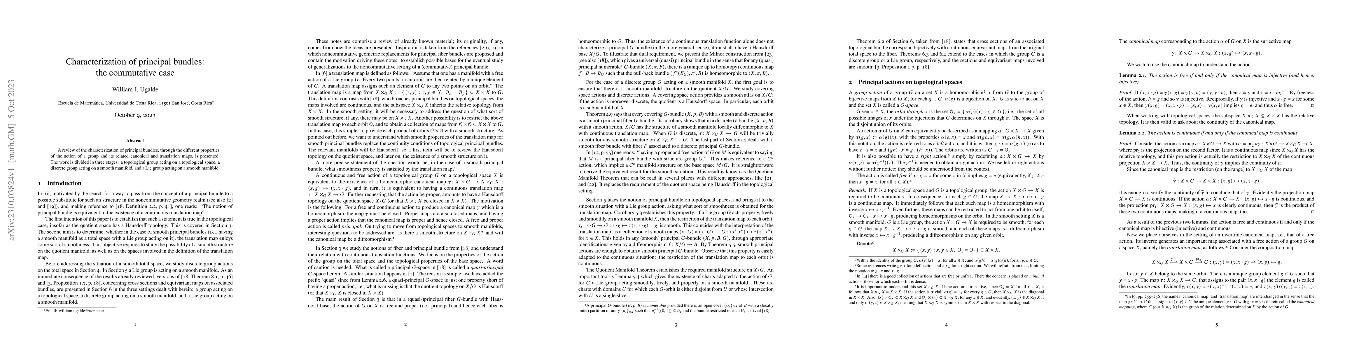 This paper reviews the characterization of principal bundles focusing on the action of groups, including topological, discrete, and Lie groups, and their respective canonical and translation maps. It examines these actions in three distinct stages: topological groups, discrete groups, and Lie groups acting on smooth manifolds.