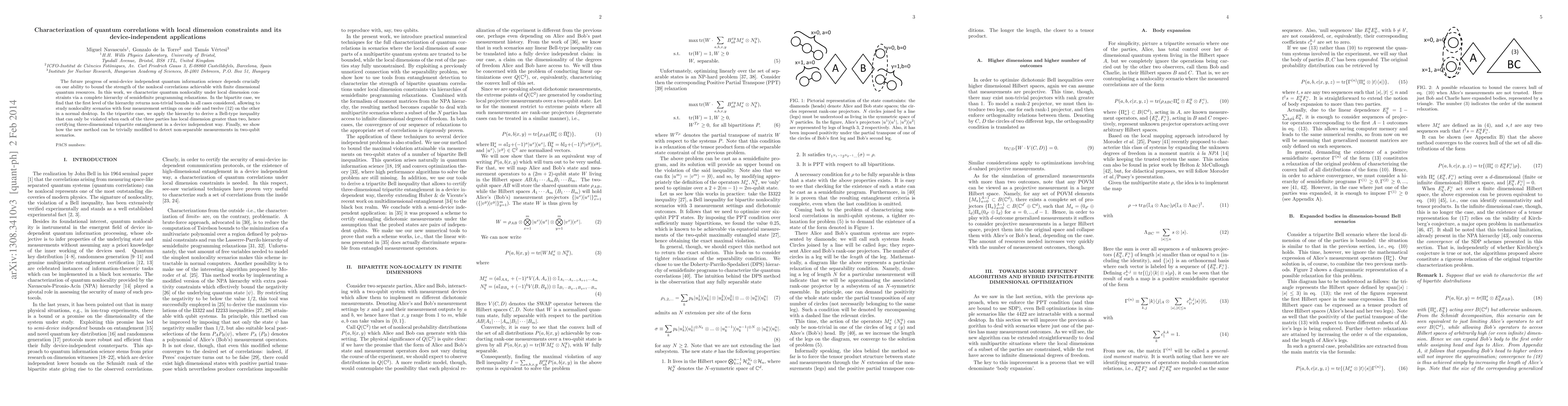 The future progress of semi-device independent quantum information science depends crucially on our ability to bound the strength of the nonlocal correlations achievable with finite dimensional quantum resources. In this work, we characterize quantum nonlocality under local dimension constraints via a complete hierarchy of semidefinite programming relaxations. In the bipartite case, we find that the first level of the hierarchy returns non-trivial bounds in all cases considered, allowing to study nonlocality scenarios with four measurement settings on one side and twelve (12) on the other in a normal desktop. In the tripartite case, we apply the hierarchy to derive a Bell-type inequality that can only be violated when each of the three parties has local dimension greater than two, hence certifying three-dimensional tripartite entanglement in a device independent way. Finally, we show how the new method can be trivially modified to detect non-separable measurements in two-qubit scenarios.