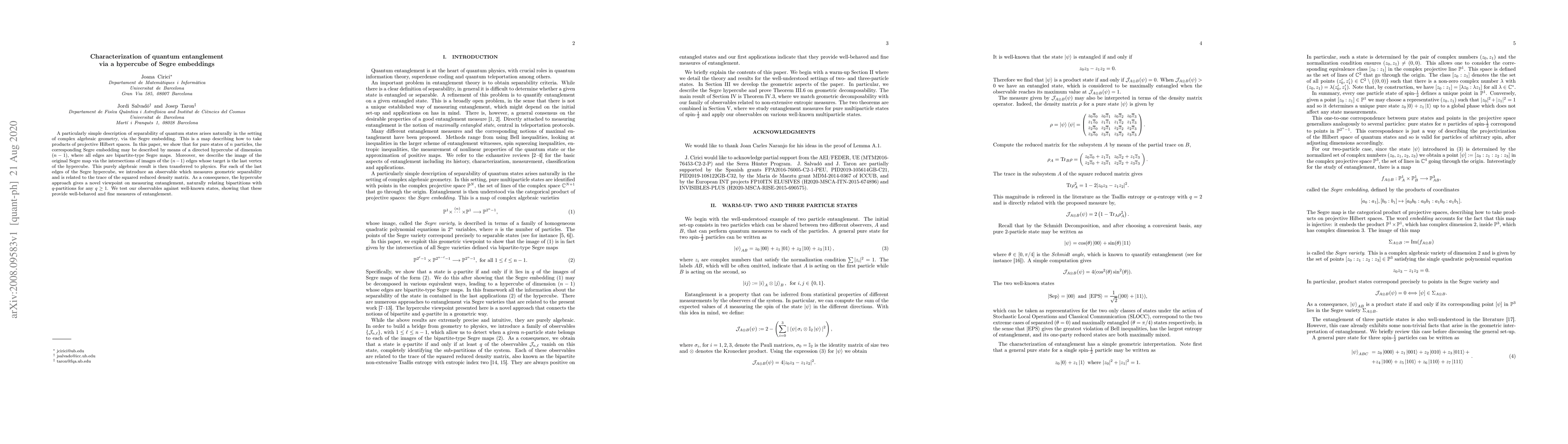 A particularly simple description of separability of quantum states arises naturally in the setting of complex algebraic geometry, via the Segre embedding. This is a map describing how to take products of projective Hilbert spaces. In this paper, we show that for pure states of n particles, the corresponding Segre embedding may be described by means of a directed hypercube of dimension n-1, where all edges are bipartite-type Segre maps. Moreover, we describe the image of the original Segre map via the intersections of images of the n-1 edges whose target is the last vertex of the hypercube. This purely algebraic result is then transferred to physics. For each of the last edges of the Segre hypercube, we introduce an observable which measures geometric separability and is related to the trace of the squared reduced density matrix. As a consequence, the hypercube approach gives a novel viewpoint on measuring entanglement, naturally relating bipartitions with $q$-partitions for q>1. We test our observables against well-known states, showing that these provide well-behaved and fine measures of entanglement.