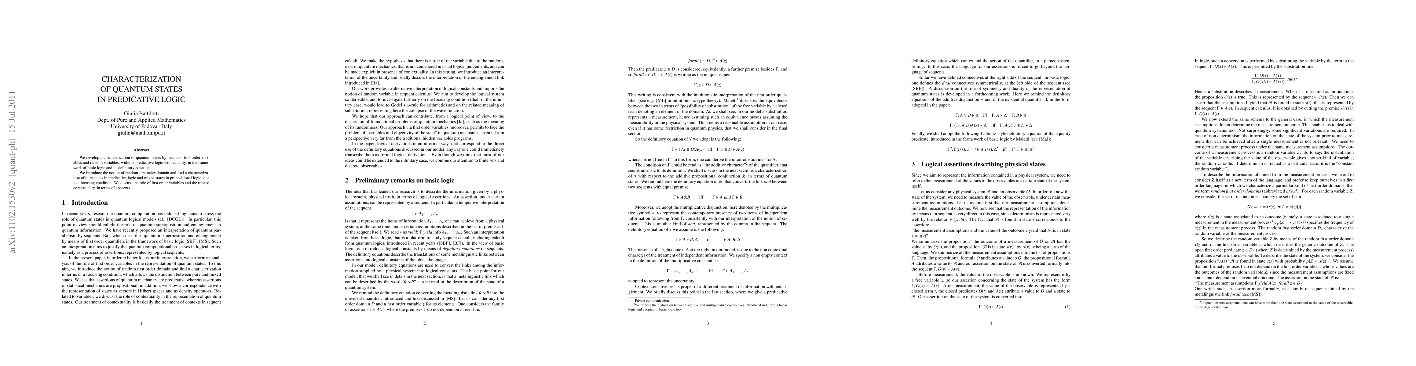 This paper characterizes quantum states using first-order variables and random variables within predicative logic, identifying pure states in predicative logic and mixed states in propositional logic through a focusing condition. It explores the contextuality of first-order variables in terms of sequents.