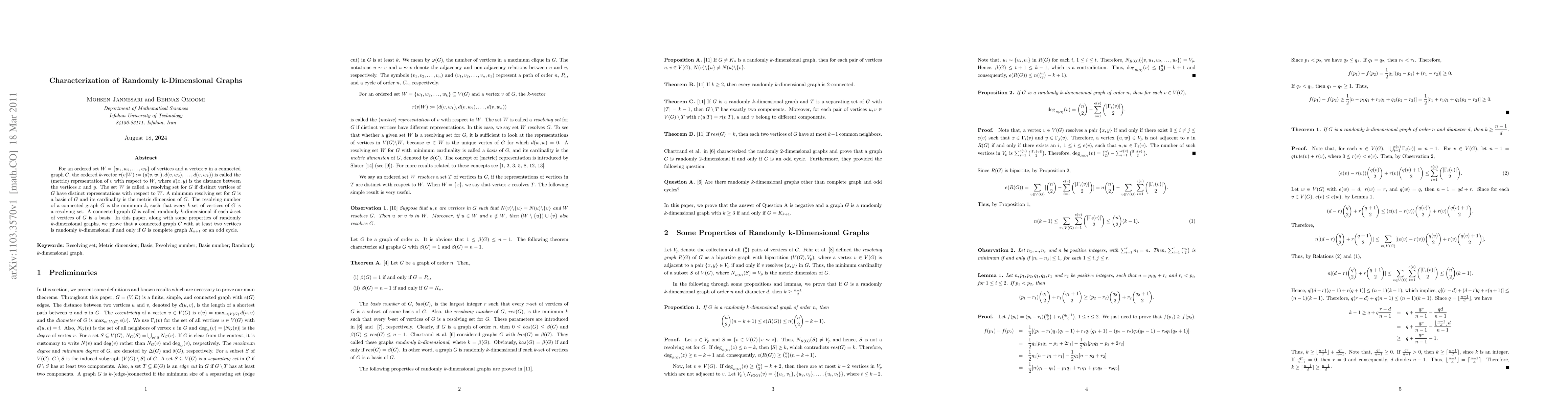 For an ordered set $W=\{w_1,w_2,...,w_k\}$ of vertices and a vertex $v$ in a connected graph $G$, the ordered $k$-vector $r(v|W):=(d(v,w_1),d(v,w_2),.,d(v,w_k))$ is called the (metric) representation of $v$ with respect to $W$, where $d(x,y)$ is the distance between the vertices $x$ and $y$. The set $W$ is called a resolving set for $G$ if distinct vertices of $G$ have distinct representations with respect to $W$. A minimum resolving set for $G$ is a basis of $G$ and its cardinality is the metric dimension of $G$. The resolving number of a connected graph $G$ is the minimum $k$, such that every $k$-set of vertices of $G$ is a resolving set. A connected graph $G$ is called randomly $k$-dimensional if each $k$-set of vertices of $G$ is a basis. In this paper, along with some properties of randomly $k$-dimensional graphs, we prove that a connected graph $G$ with at least two vertices is randomly $k$-dimensional if and only if $G$ is complete graph $K_{k+1}$ or an odd cycle.