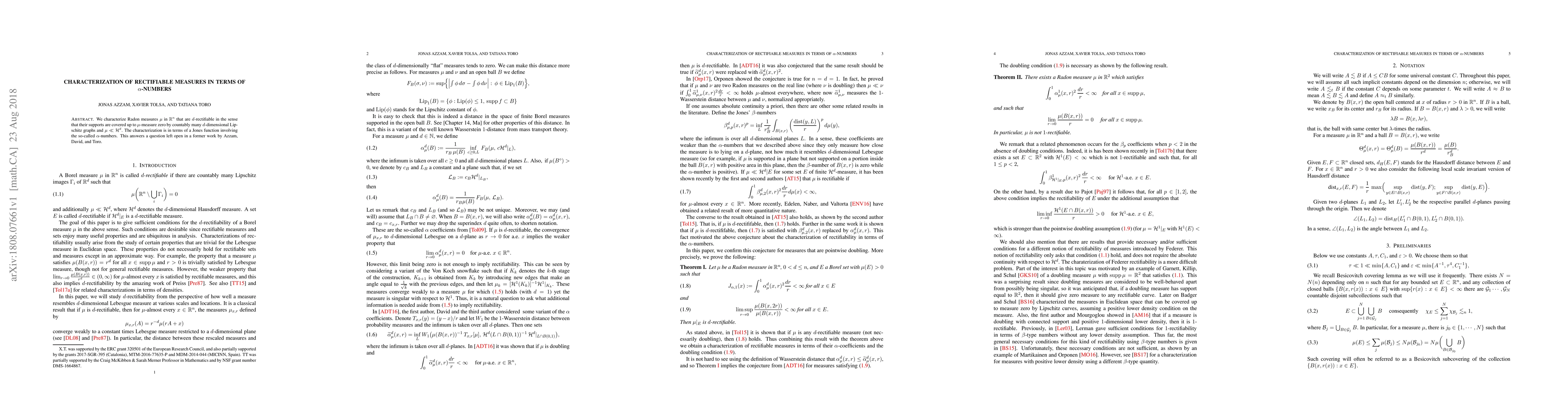 This paper characterizes $d$-rectifiable Radon measures in $\mathbb{R}^{n}$ by showing they can be covered by countably many $d$-dimensional Lipschitz graphs, with the characterization relying on a Jones function involving $\alpha$-numbers. This resolves a question posed by Azzam, David, and Toro.