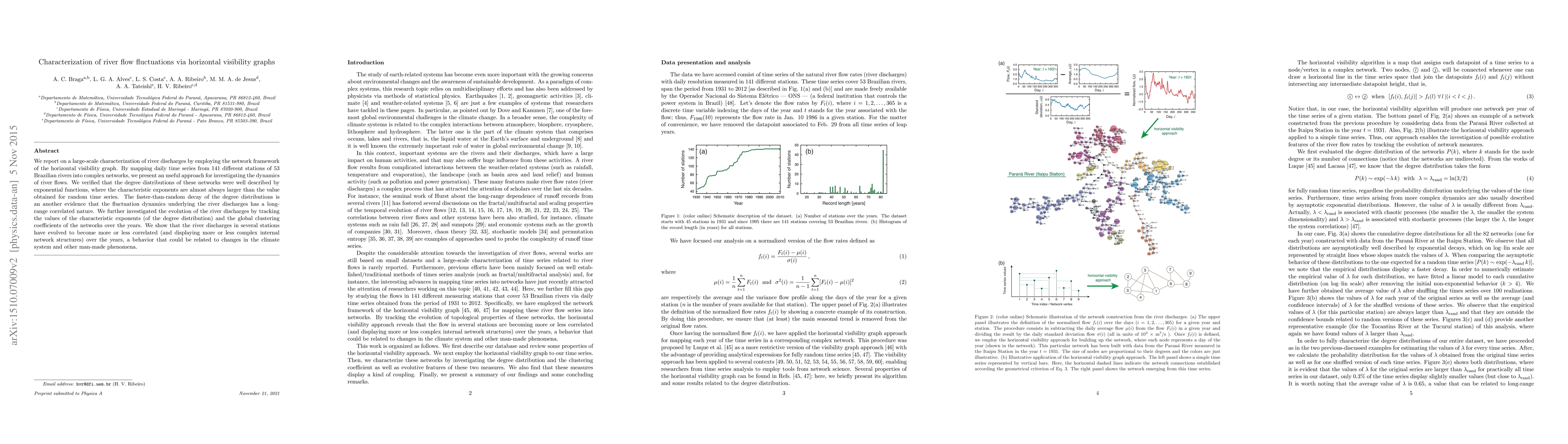 This study characterizes river flow fluctuations using horizontal visibility graphs, revealing that river discharges exhibit long-range correlated dynamics. The analysis of 141 Brazilian river stations shows that the degree distributions of the resulting networks decay faster than random, indicating evolving correlations over time likely influenced by climate and human activities.