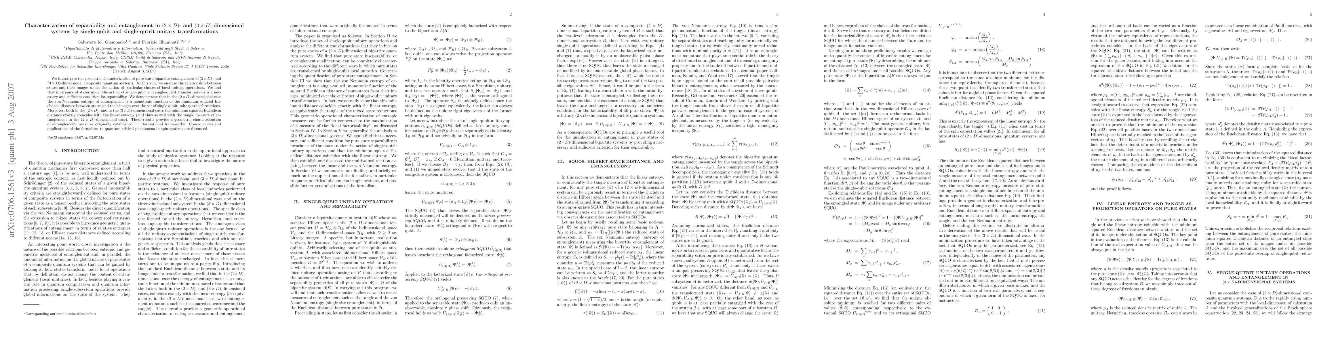 This paper investigates the geometric characterization of entanglement in $(2\times{D})$- and $(3\times{D})$-dimensional quantum systems, revealing that separability is determined by invariance under single-qubit and single-qutrit transformations. It finds that entanglement measures correlate with the minimum squared Euclidean distance between states and their unitary transformations.