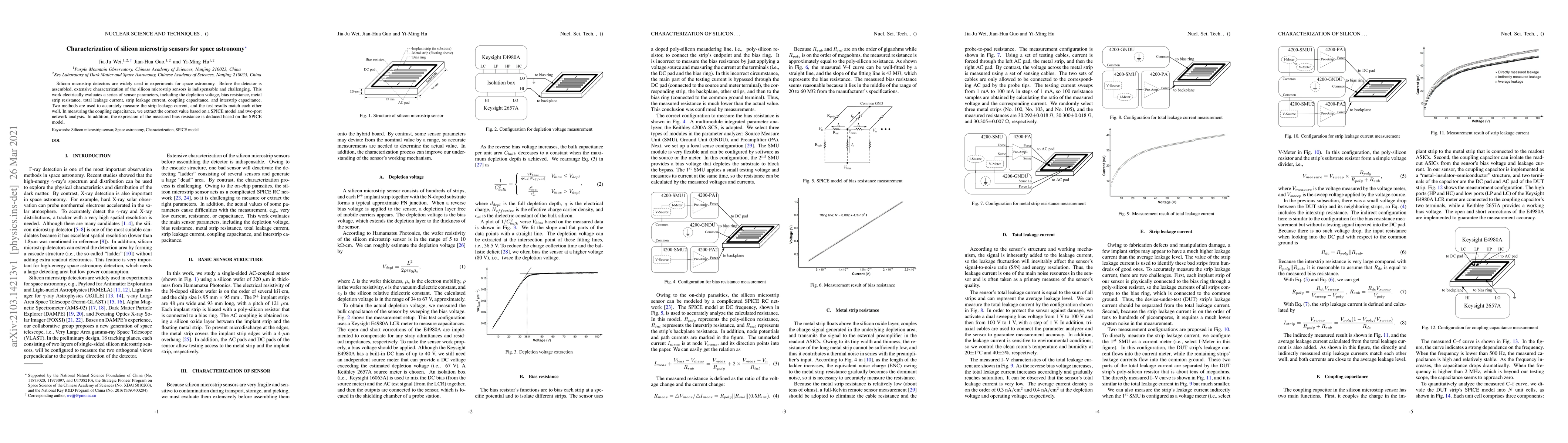 This paper characterizes silicon microstrip sensors for space astronomy by evaluating key parameters such as depletion voltage, bias resistance, and leakage currents. Accurate measurement methods for strip leakage current and coupling capacitance are developed, validated through SPICE modeling and two-port network analysis.