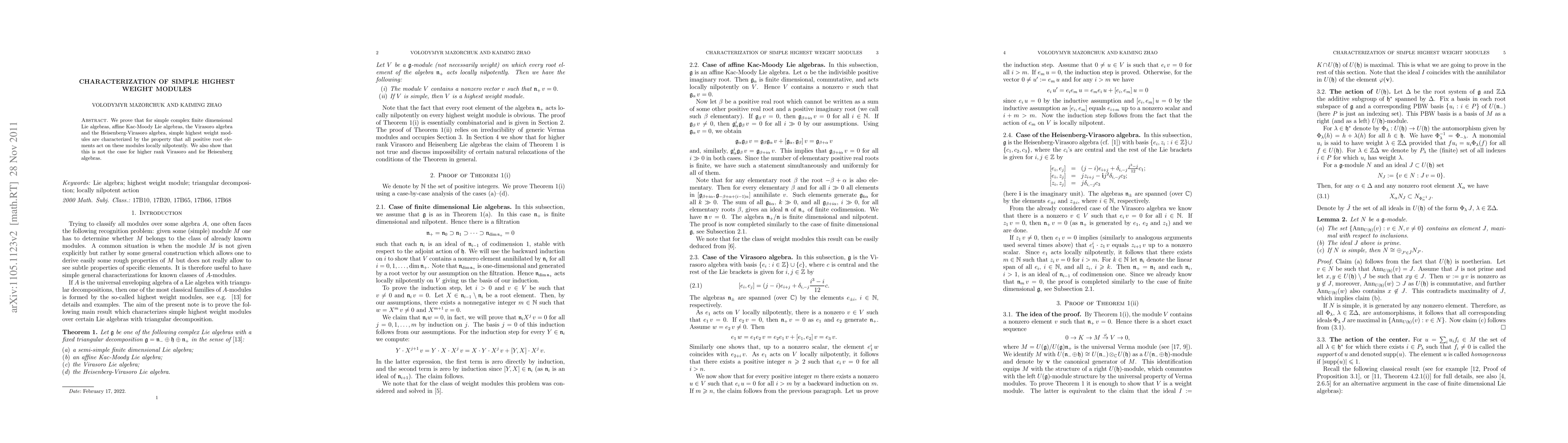 This paper characterizes simple highest weight modules for several types of Lie algebras, proving that for affine Kac-Moody, Virasoro, and Heisenberg-Virasoro algebras, these modules are identified by the action of positive root elements that is locally nilpotent. It also demonstrates that this property does not hold for higher rank Virasoro and Heisenberg algebras.