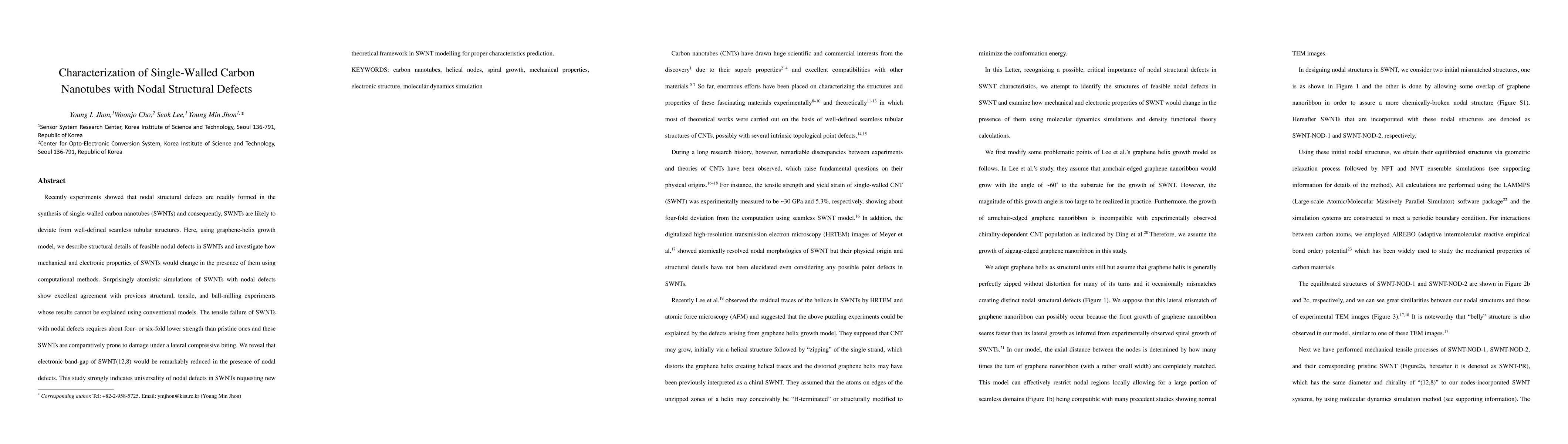 Researchers studied single-walled carbon nanotubes with nodal structural defects, finding that they require less strength to break and have a reduced electronic band-gap, challenging current modeling approaches.