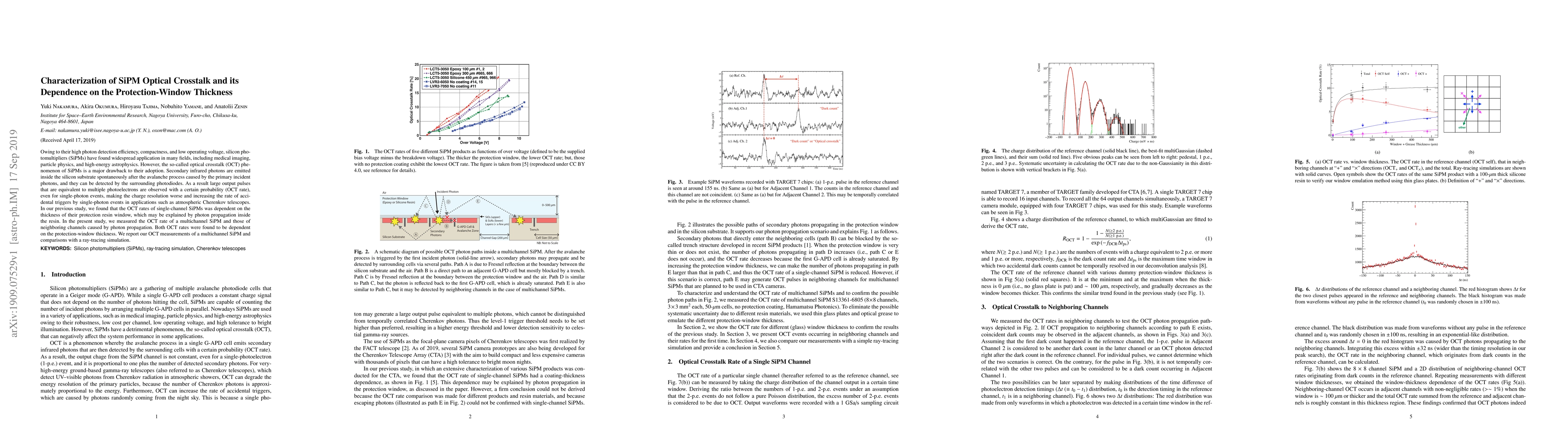 This paper investigates the optical crosstalk (OCT) in silicon photomultipliers (SiPMs) and its dependence on the protection-window thickness. The study finds that OCT rates, which can degrade charge resolution and increase accidental triggers, are influenced by the thickness of the protection resin window, as demonstrated through both experimental measurements and ray-tracing simulations.