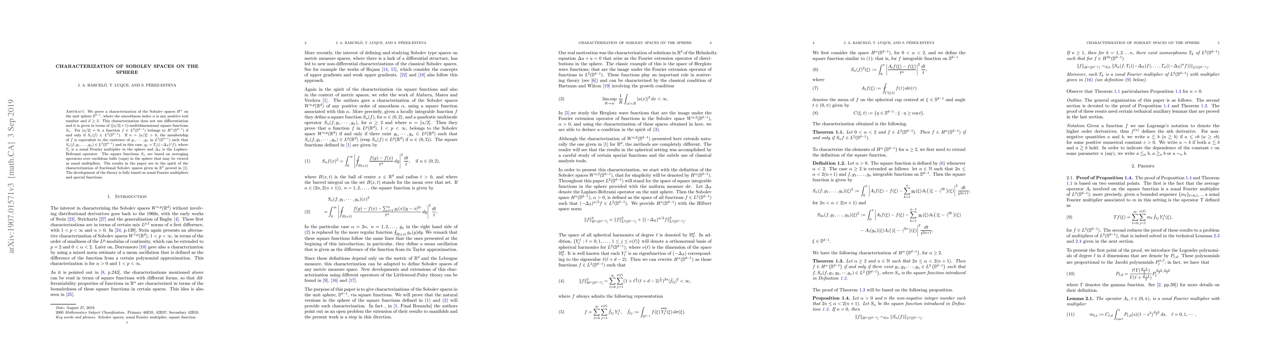 This paper characterizes Sobolev spaces $H^\alpha$ on the unit sphere $\mathbb{S}^{d-1}$ using multidimensional square functions $S_\alpha$ without differentiation. The characterization depends on the smoothness index $\alpha$ and the existence of specific functions $g_j$ in $L^2(\mathbb{S}^{d-1})$, leveraging zonal Fourier multipliers and the Laplace-Beltrami operator.