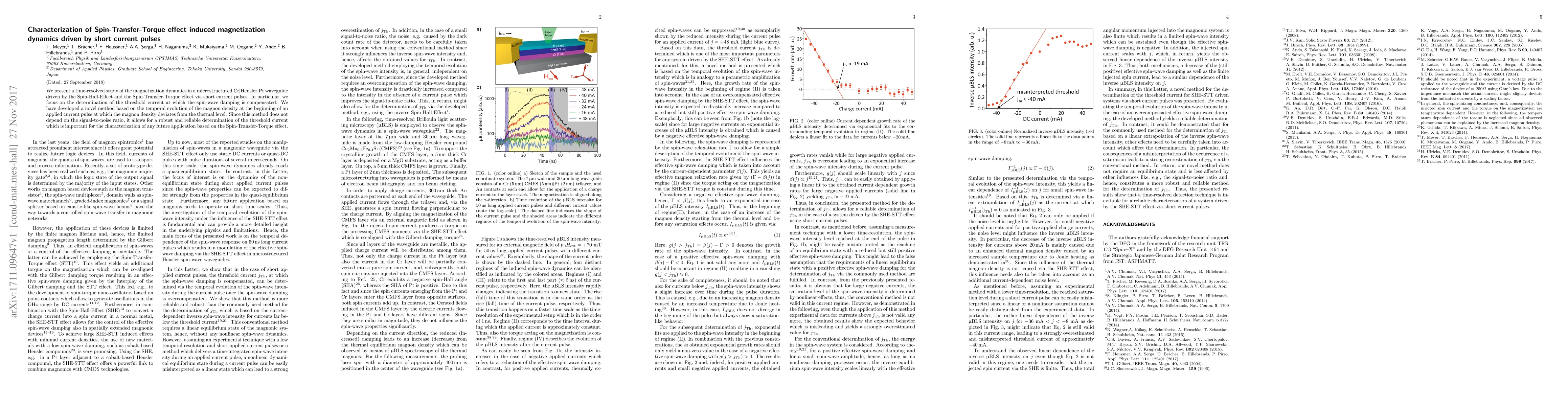 We present a time-resolved study of the magnetization dynamics in a microstructured Cr$|$Heusler$|$Pt waveguide driven by the Spin-Hall-Effect and the Spin-Transfer-Torque effect via short current pulses. In particular, we focus on the determination of the threshold current at which the spin-wave damping is compensated. We have developed a novel method based on the temporal evolution of the magnon density at the beginning of an applied current pulse at which the magnon density deviates from the thermal level. Since this method does not depend on the signal-to-noise ratio, it allows for a robust and reliable determination of the threshold current which is important for the characterization of any future application based on the Spin-Transfer-Torque effect.
