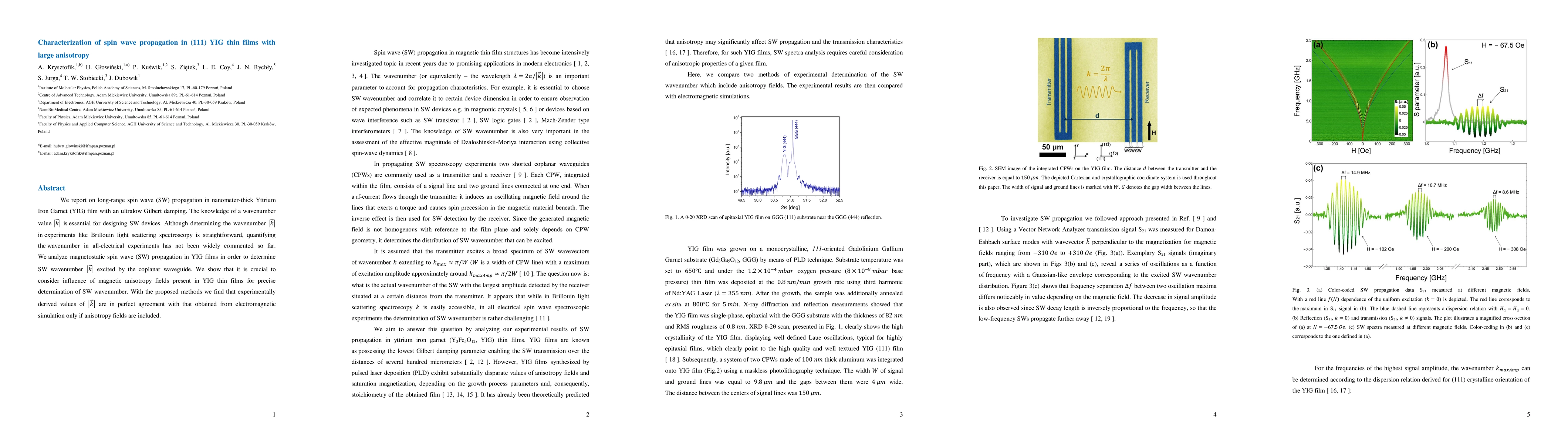 This paper investigates long-range spin wave propagation in ultrathin YIG films with low Gilbert damping, focusing on determining the wavenumber $|\vec{k}|$ crucial for SW device design. It highlights the importance of considering magnetic anisotropy fields in YIG thin films for accurate wavenumber determination, showing that experimental results align with simulations when these fields are accounted for.