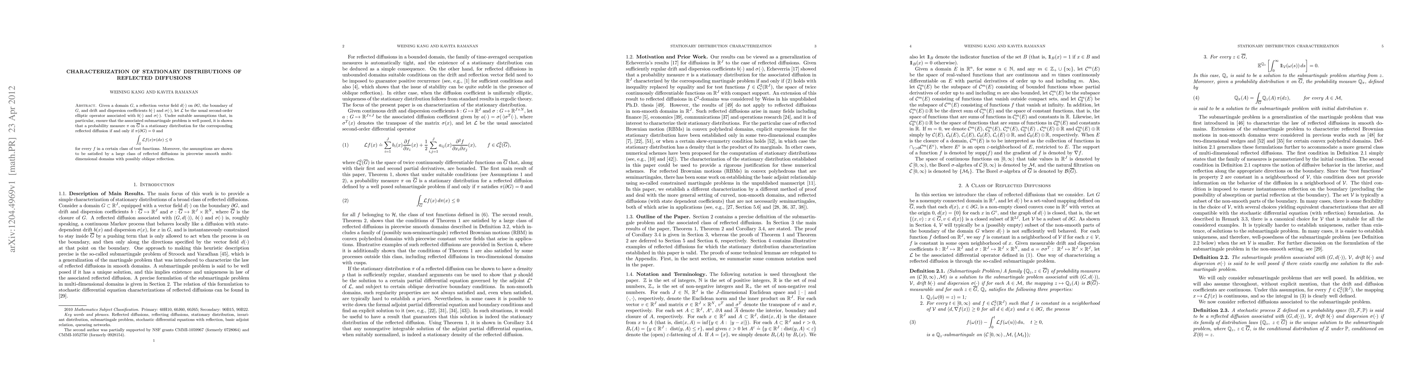 Given a domain G, a reflection vector field d(.) on the boundary of G, and drift and dispersion coefficients b(.) and \sigma(.), let L be the usual second-order elliptic operator associated with b(.) and \sigma(.). Under suitable assumptions that, in particular, ensure that the associated submartingale problem is well posed, it is shown that a probability measure $\pi$ on \bar{G} is a stationary distribution for the corresponding reflected diffusion if and only if $\pi (\partial G) = 0$ and $\int_{\bar{G}} L f (x) \pi (dx) \leq 0$ for every f in a certain class of test functions. Moreover, the assumptions are shown to be satisfied by a large class of reflected diffusions in piecewise smooth multi-dimensional domains with possibly oblique reflection.